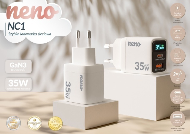 Neno NC1 este un încărcător de rețea rapid, compact și ușor, cu o putere de 35W, echipat cu două porturi USB (USB-C și USB-A). Utilizând tehnologia GaN3, oferă o încărcare eficientă și rapidă, consumând mai puțină energie. Dispune de un afișaj LED care arată puterea în wați în timp real și include protecții împotriva supraîncărcării, suprasarcinii/scurtcircuitului și supraîncălzirii, asigurând o utilizare sigură. Compatibil cu majoritatea produselor Neno și cu diverse dispozitive precum smartphone-uri și tablete.