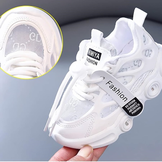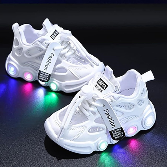 Adidasi albi pentru copii cu lumini LED integrate in talpa, perfecti pentru activitati zilnice si joaca.