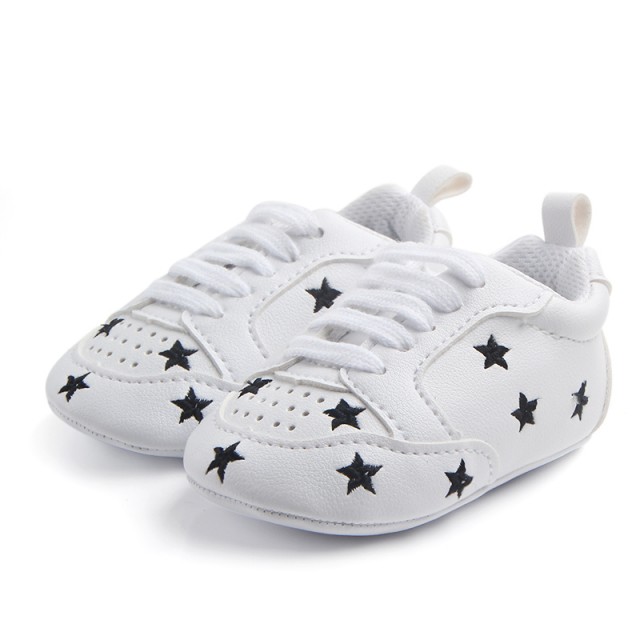 Adidasi fetite din piele ecologica, albi cu stelute negre, se inchid cu siret.