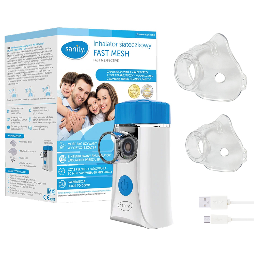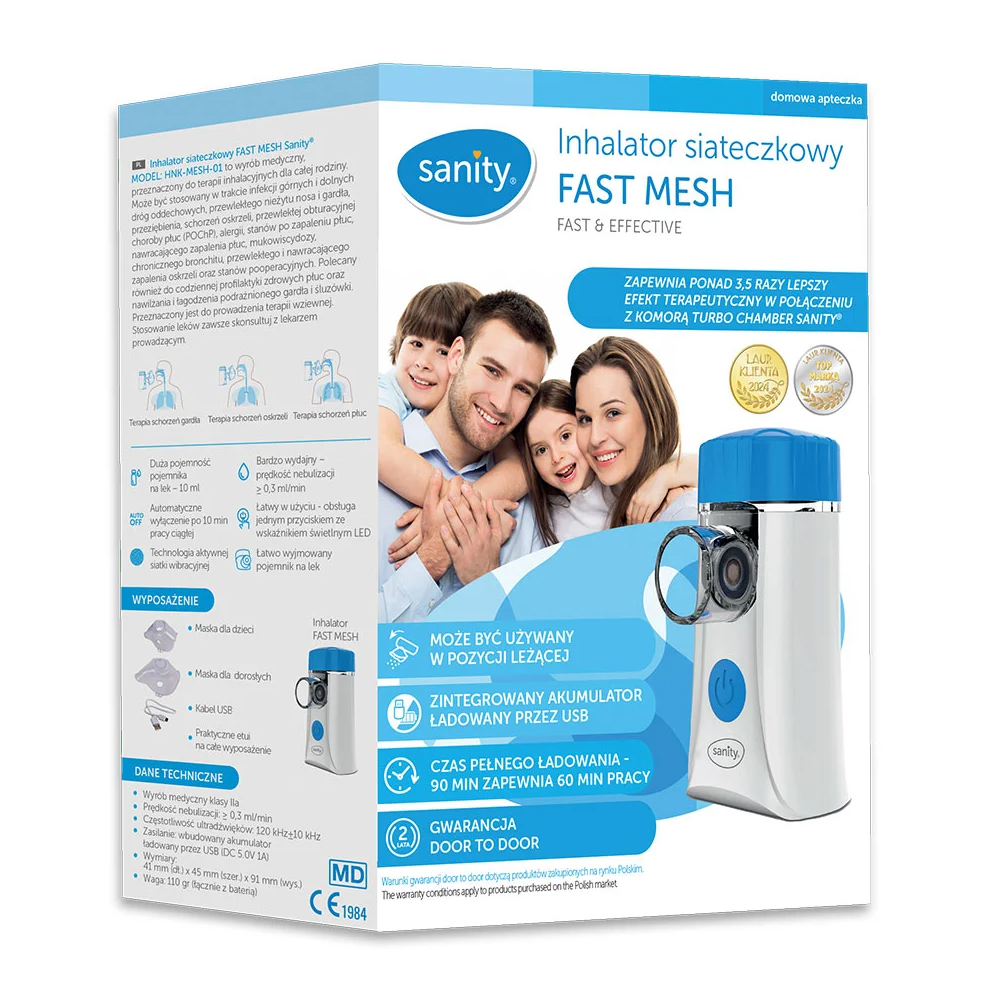 Aparat aerosoli Sanity Fast Mesh, pentru copii si adulti, portabil, capacitate cupa 10 ml, cablu USB, masca copii si adulti, silentios, Alb Aparatul de aerosoli Sanity Fast Mesh este un inhalator portabil, inovator, bazat pe tehnologia de plasa vibranta activa, conceput pentru a oferi o terapie respiratorie de inalta calitate, indiferent unde te afli. Compact, usor si extrem de eficient, Sanity Fast Mesh transforma experienta inhalarii intr-una simpla si placuta, adaptandu-se perfect nevoilor utilizatorilor de toate varstele. Beneficii cheie ale inhalatorului Fast Mesh: Incarcare rapida Dispozitivul se incarca complet in doar 90 de minute, asigurand 60 de minute de functionare continua. Perfect pentru utilizare acasa sau in calatorii. Atentie: Incarca dispozitivul complet inainte de utilizare pentru o eficienta maxima! Tehnologia de plasa vibranta activa Performanta de neegalat datorita unei viteze de nebulizare de peste 0,3 ml min, ceea ce il face ideal pentru tratamentele respiratorii variate. Rezervor mare pentru medicamente Capacitatea generoasa de 10 ml permite sesiuni prelungite de inhalare, reducand frecventa reumplerilor. Oprire automata dupa 10 minute Functie inteligenta pentru siguranta sporita si economie de energie, indiferent de context. Operare intuitiva Butonul unic si indicatorul LED integrat faciliteaza utilizarea dispozitivului, chiar si pentru cei mai putin familiarizati cu tehnologia. Usor de curatat Recipientul pentru medicamente, detasabil si simplu de igienizat, garanteaza intretinerea rapida si corecta a dispozitivului. Design ergonomic Poate fi utilizat inclusiv in pozitie culcata, oferind confort suplimentar in timpul terapiei respiratorii. Fiabilitate si confort Sanity Fast Mesh este partenerul ideal pentru tratamentele respiratorii zilnice. Compact (doar 110 g, inclusiv bateria) si silentios (nivel de zgomot 40 dB), inhalatorul poate fi utilizat fara a deranja activitatile din jur. Indiferent daca esti acasa, la birou sau in vacanta, Fast Mesh iti ofera solutia moderna pentru o respiratie usoara. Specificatii tehnice Model: HNK-MESH-01 Tehnologie: Plasa vibranta activa Sursa de alimentare: Acumulator reincarcabil prin USB (DC 5.0V 1A) Consum de energie: 4.0 W Viteza de nebulizare: , 0.3 ml min Dimensiunea particulelor (MMAD): 5 μm Frecventa de lucru: 120 kHz 10 kHz Capacitate rezervor medicamente: 10 ml Temperatura de lucru: 5 C , 40 C Zgomot: 40 dB Dimensiuni: 41 mm (L) x 45 mm (W) x 91 mm (H) Greutate: 110 g (inclusiv bateria) Clasificare: Echipament clasa II, tip BF Continutul pachetului : - Inhalator Sanity Fast Mesh; - Masca pentru copii; - Masca pentru adulti; - Cablu USB pentru incarcare; - Husa practica pentru transport si depozitare. Alege confortul si solutiile moderne Fast Mesh de la Sanity imbina tehnologia avansata cu designul ergonomic, oferindu-ti o terapie respiratorie eficienta, oriunde si oricand. Indiferent de nevoile tale, acest dispozitiv compact si fiabil este solutia ideala pentru o sanatate respiratorie optima. Sanity Fast Mesh , Terapia ta respiratorie, oriunde te-ai afla! Acesta este un dispozitiv medical.,41 mm (L) x 45 mm (W) x 91 mm (H