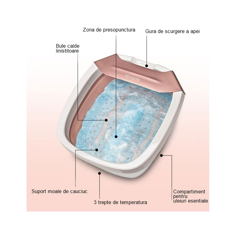 Aparat de hidromasaj pliabil pentru picioare REVLON Ultimate Indulgence Foot Spa, RVFB7034E Caracteristici: - Masaj cu bule pentru picioare - Functie de incalzire a apei - 3 setari de temperatura - Sistem de scurgere lenta a apei - Compartiment pentru uleiuri esentiale - Suport moale cu proeminente in forma de buline - Zona de presopunctura cu orificii de presiune - Design pliabil, usor de depozitat Masaj delicat si relaxant Aparatul de hidromasaj pliabil Revlon Ultimate Indulgece Foot Spa este perfect pentru a oferi picioarelor tale un masaj relaxant si delicat, dar si pentru a pregati mai bine pielea pentru pedichiura. Cu acest aparat de hidromasaj obtii un masaj de relaxare cu bule si un tratament delicat pentru picioarele tale chiar la tine acasa. Functia de incalzire a apei dispune de 3 setari de temperatura pentru o relaxare sporita. Datorita functiei de pliere, acesta poate fi depozitat cu usurinta fara sa ocupe prea mult spatiu. Functia de barbotare Pentru un masaj relaxant cu bule si pregatirea pentru pedichiura. Datorita functiei de barbotare se obtine un efect de spa, care ofera o senzatie placuta si relaxanta picioarelor. Suport moale de cauciuc Suportul, proiectat in jurul zonei de presopunctura, este ca un covoras moale cu proeminente in forma de buline, care ofera un masaj delicat si relaxant picioarelor. Pliabil si compact Dispozitivul se pliaza astfel incat are doar 11 cm inaltime, ceea ce va permite sa il depozitati usor oriunde doriti. Compartiment pentru ueleiuri esentiale Adaugati cateva picaturi de uleuri esentiale pentru o atmosfera unica, similara cu cea din saloanele de infrumusetare. 3 trepte de temperatura Dispozitivul are functia de a incalzi apa si de a o mentine la temperatura selectata. Datorita acestei functii, apa va ramane la temperatura potrivita pe tot parcursul masajului. Specificatii: Tip produs: Bazin hidromasaj Zona corporala: Picioare Tip utilizare: Uz casnic; Profesional Utilizare: Masaj; Pedichiura Alimentare: La retea Tensiune alimentare: 220 - 240 V Putere: 105 W Trepte de temperatura: 3 Dimensiuni: 41 x 41 x 11 cm Greutate: 2.1 kg,41 x 41 x 11 cm