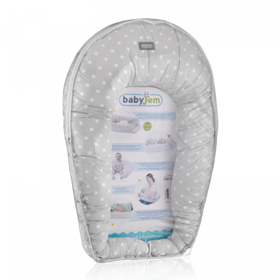 * Protectia moale si comoda, in forma de cuib, il tine pe cel mic intr-o pozitie sigura, astfel incat sa nu se rostogoleasca.