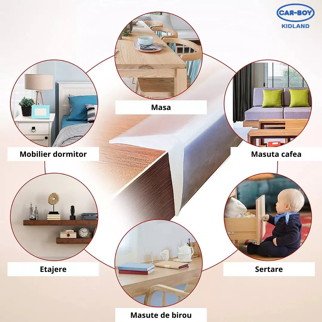 Banda protectie colturi, transparenta, 40cm, set 2 buc - Descriere Banda protectie colturi, transparenta, 40cm, set 2 buc de la carboysafety.ro Casa ta este plina de muchii ascutite: masa de sufragerie din sticla, colturile patului, colturi si sectiuni ale peretilor, biroul de lucru si scaunele pot avea aceste colturi potential periculoase in care copiii tai se pot rani daca alearga sau se ciocnesc de ele. Un produs eficient pentru protejarea copiilor de accidente si lovituri in jurul mobilierului este o banda de protectie transparenta. Aceasta banda este conceputa pentru a fi aplicata pe marginile ascutite sau periculoase ale mobilierului, cum ar fi mese, birouri, dulapuri, scaune etc. Ea serveste ca o bariera amortizanta, reducand riscul de ranire in cazul in care un copil se loveste sau intra in contact cu aceste obiecte. Ele sunt transparente, astfel incat nu afecteaza estetica mobilierului si se pot potrivi cu diverse stiluri si culori. Benzile de protectie pot fi indepartate fara a lasa urme sau a deteriora suprafata mobilierului. Aceasta inseamna ca le poti utiliza temporar, pana cand copiii vor fi suficient de mari pentru a evita accidentele. Ideale pentru mesele rotunde sau patrate, adaptabila la aproape orice forma de muchie datorita materialului flexibil din care este confectionata. Banda de protectie pentru muchii, transparenta, poate fi instalata pe picioarele meselor, muchiile dulapurilor, marginea televizoarelor, marginile paturilor, a patuturilor, muchiile peretilor, muchiile altor obiecte din locuinta, gradinita, loc de joaca, sala de sport, si alte locuri destinate copiilor si nu numai etc. Benzile de protectie pot fi utile pentru protejarea persoanelor in varsta sau a celor cu mobilitate redusa de lovituri accidentale in jurul mobilierului. Ele pot fi aplicate pe marginile obiectelor, cum ar fi mesele de cafea sau scaunele, pentru a reduce riscul de ranire. Protectoarele pentru muchiile mobilierelor si a altor muchii au o suprafata rezistenta la zgarieturi, datorita densitatii mari au o rezistenta mai mare la rupere. Benzile de protectie transparente sunt flexibile si usor de instalat. Ele pot fi taiate in lungimea dorita si apoi fixate pe colturile sau marginile obiectelor utilizand banda dublu adeziva, silicon, sau adezivi puternici. Banda dublu-adeziva este inclusa in set. Benzile de protectie muchii pentru copii respecta pe deplin reglementarile UE privind siguranta copiilor. Dimensiuni disponibile: 18(l)x400(L)x 11(h)interior x15(h) x4(grosime) 24(l)x400(L)x 16(h)interior x22(h) x6(grosime) Producator : CAR-BOY CO LTD In gama noastra de Protectii pentru copii mai gasiti si alte tipuri de protectii utile minimizarii riscurilor de accidente si rani. Banda protectie colturi, transparenta, 40cm, set 2 buc - Alege siguranta pentru copilul tau cu ajutorul Carboysafety!