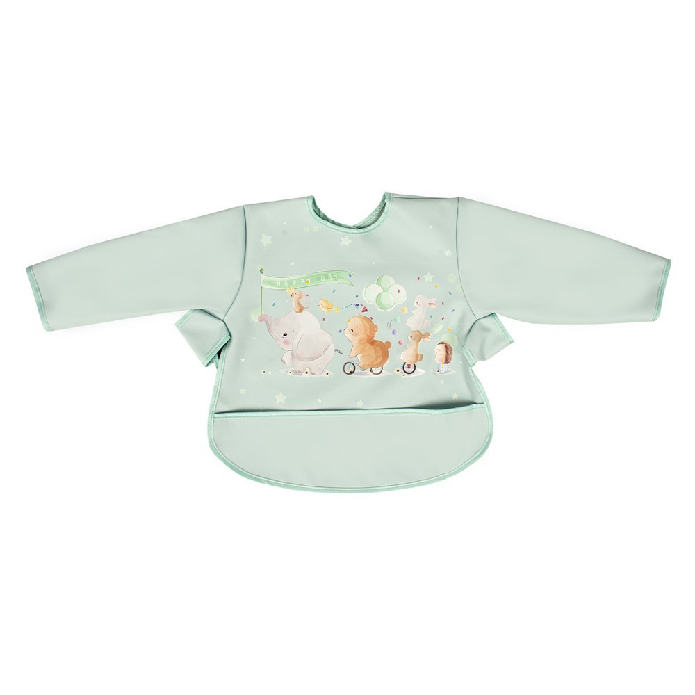 Baveta impermeabila pentru copii cu maneci lungi si buzunar de colectare, conceputa pentru a mentine hainele uscate si copilul usor de gestionat in timpul activitatilor in aer liber.