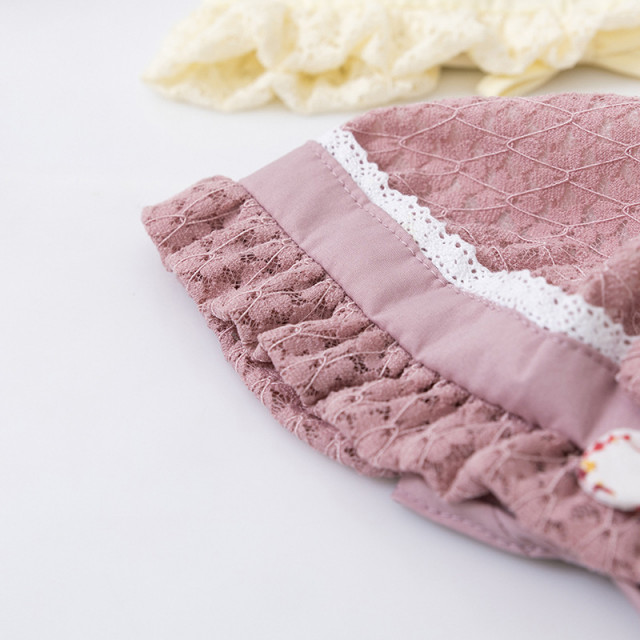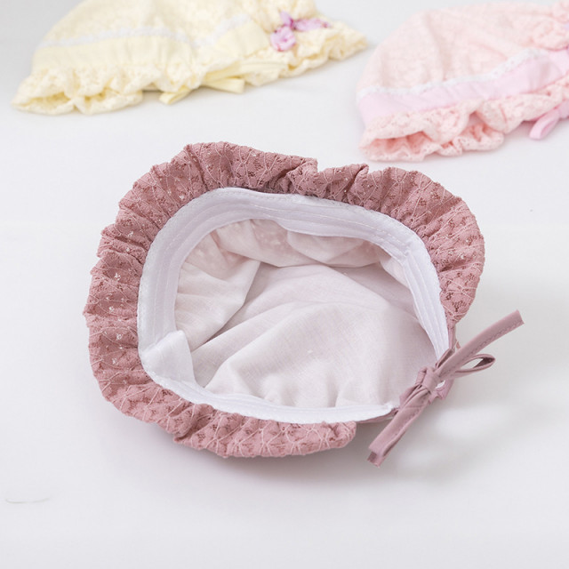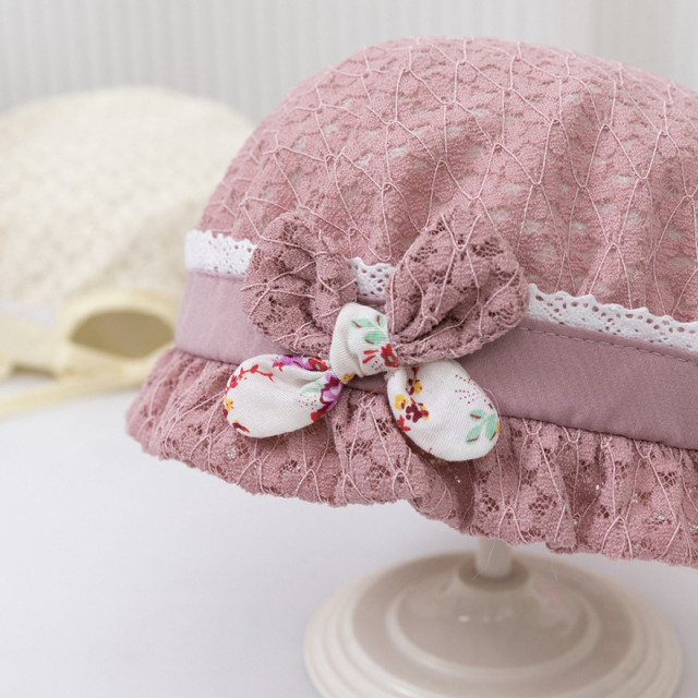 Boneta pentru fetite, din dantela, prevazuta cu o fundita aplicata intr-o parte.