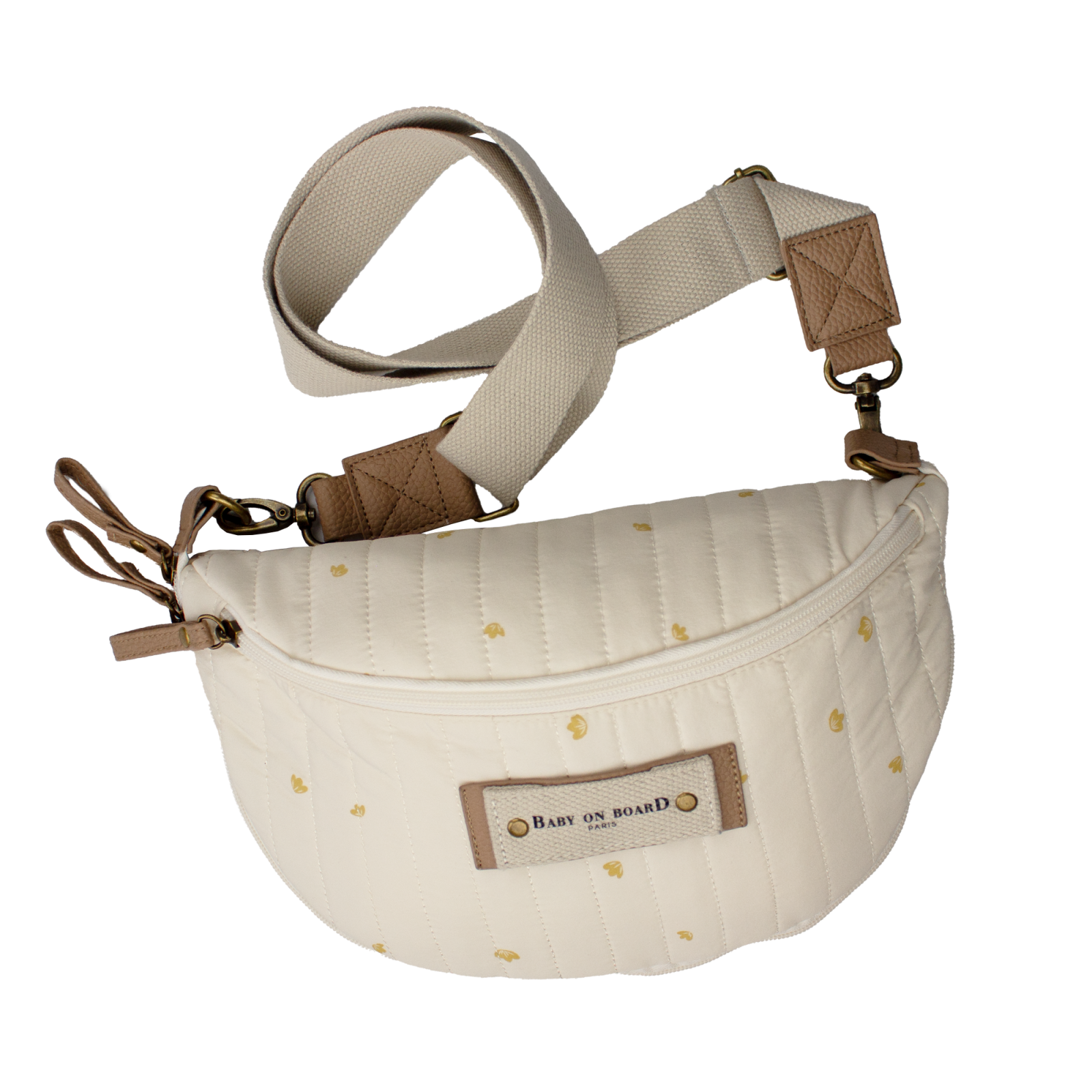 Cureaua ajustabila de la 60 cm la 110 cm transforma Borseta bebelusi Baby On Board Armelle Banana Cotton in crossbody urban sau in borseta clasica. Carabinierele permit fixarea pe carucior atunci cand doresti eliberarea umerilor.