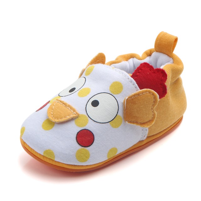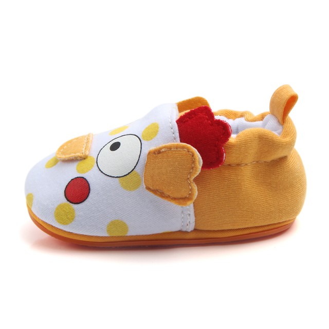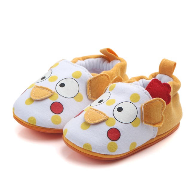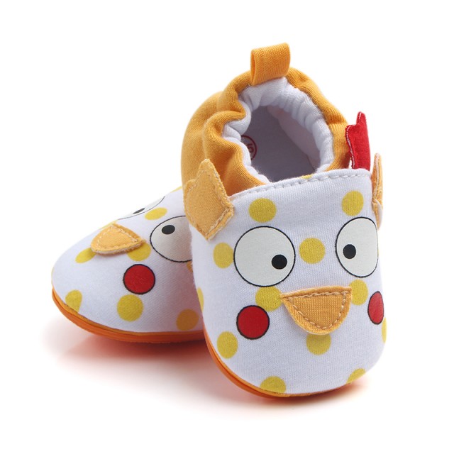 Botosei albi cu portocaliu pentru bebelusi, cu un puiut aplicat in fata si cu bulinute galbene. Sunt prevazuti cu elastic la spate.