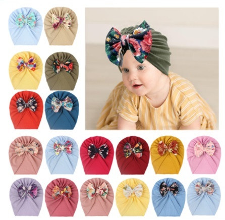 Caciulita tip turban pentru micutele domnisoare, cu o fundita inflorata aplicata in fata.