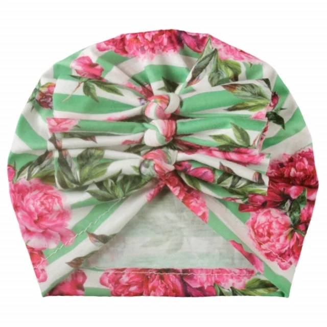 Acest produs Caciulita tip turban inflorata cu dungi verzi si fundite in fata este model MBx-20021-2-CT2