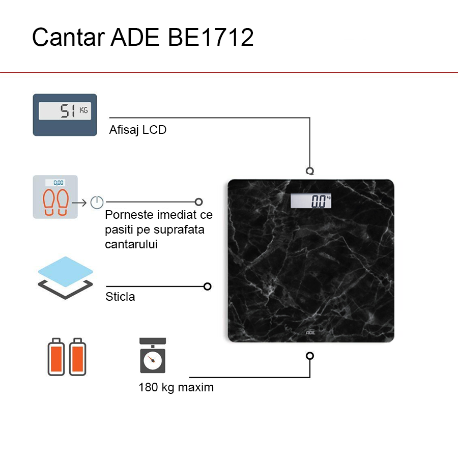 Ultima actualizare a informațiilor de prezentare pentru Cantar corporal electronic ADE BE1712 Aurora, Model Marmura, Ecran LCD, Negru BITauroranegru a fost efectuată la data de 24.04.2026
