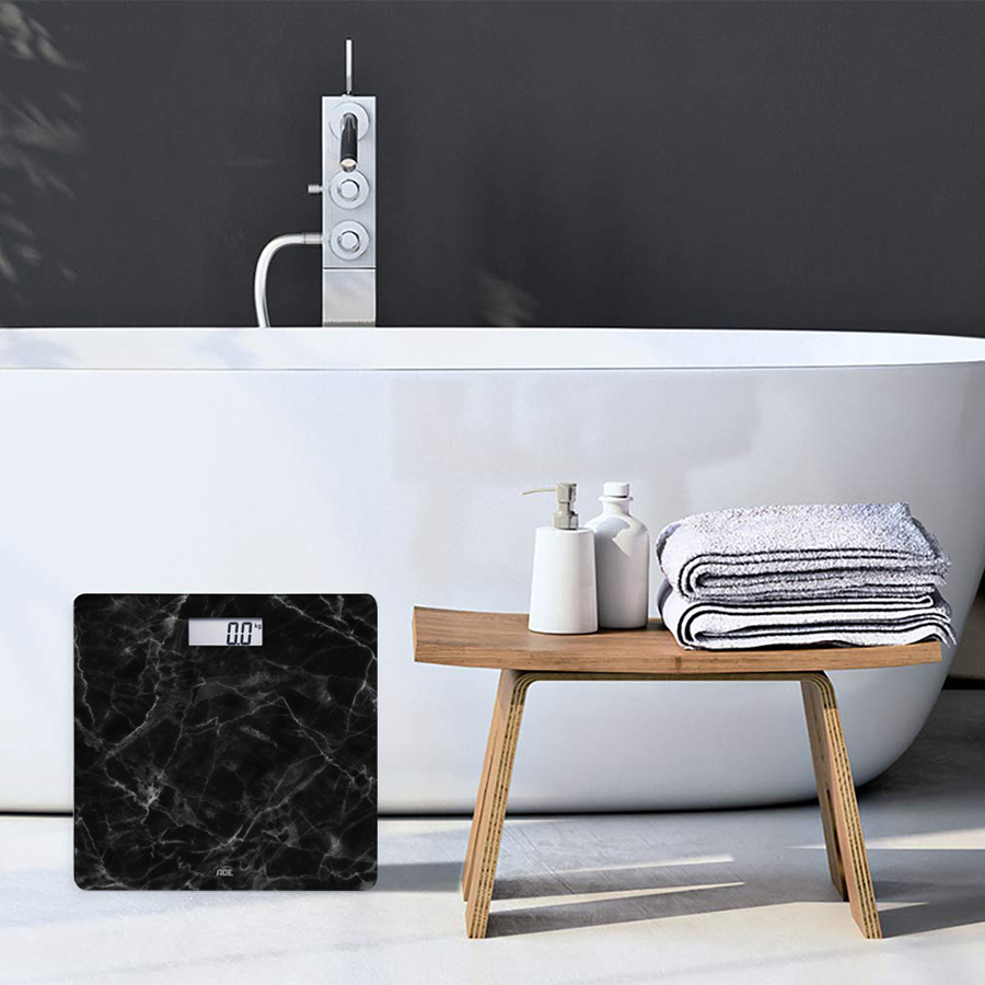 Cantar corporal electronic ADE BE1712 Aurora, Model Marmura, Ecran LCD, Negru Cantarul corporal electronic ADE BE1712 Aurora combina functiile inteligente cu un design extraordinar, ideal pentru interioare atat simple, cat si elegante. Acesta permite masurarea si controlarea greutatii corporale la adulti, adolescenti si copii (8 ani +). Caracteristici: - Design elegant pentru baie; - Greutate suportata de pana la 180 kg; - Ecran LCD mare; - Cantarul porneste prin sistemul (tehnologia) Step-On; - Oprire automata; - Alimentare cu 1 baterie CR2032 3V inclusa in pachet. Cantarul corporal electronic ADE BE1712 Aurora are un model din marmura peste care s-a adaugat o sticla speciala de siguranta, utilizata in industria auto. Acesta a fost fabricat in conformitate cu standardele europene si respecta dispozitiile directivelor CE (Directiva EMC 2014 30 UE; Directiva RoHS 2011 65 UE). Avand un ecran LCD usor de citit, cu un afisaj ce masoara 73 x 28 mm, cantarul corporal electronic ADE BE1712 Aurora este foarte usor de utilizat si rezista la greutati de pana la 180 kg. Acesta afiseaza greutatea in Kg, lb, st. Tehnologia Step - On, pur si simplu va urcati pe cantar si va masurati. Cantarul corporal electronic ADE BE1712 Aurora are o functie de oprire automata si afiseaza, de asemenea, starea bateriei. Alimentarea cantarului corporal electronic ADE BE1712 Aurora se face cu 1 baterie CR2032 3V inclusa in pachet. Este necesar sa schimbati bateria atunci cand pe afisaj apare LO sau nu se mai afiseaza nimic. 1. Butonul Unit - schimbarea unitatii de masura; 2. Compartimentul pentru baterie; 3. Afisaj; 4. Suprafata de cantarire. Avertismente: - Nu va urcati pe cantar cu picioarele ude si nu pasiti pe cantar daca suprafata acestuia este umeda; - Greutatea masurata este afisata la scurt timp dupa pasirea pe cantar; - La cateva secunde dupa ce ati parasit suprafata de cantarire, cantarul se opreste automat; - Cantariti-va fara haine, daca este posibil.,300 x 300 x 20 mm