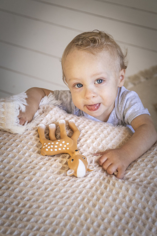 * Simtul tactil: foarte usoar, capriorul Fanfan este perfect adaptat manutelor mici ale bebelusului. Fin la atingere, ca si pielea mamei, jucaria are efecte linistitoare asupra bebelusului.