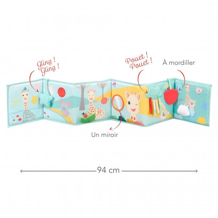 Contine 12 pagini ilustrate cu activitati multiple: culori vibrante și contrastate panglici si diverse materiale (hartie de artizanat, velcro ...) o chitaitoare, o oglinda, un inel dentitie, clopotel. Aceasta carte poate fi asezata la sol, atarnata de patut sau la locul de joaca datorita celor 6 legaturi.