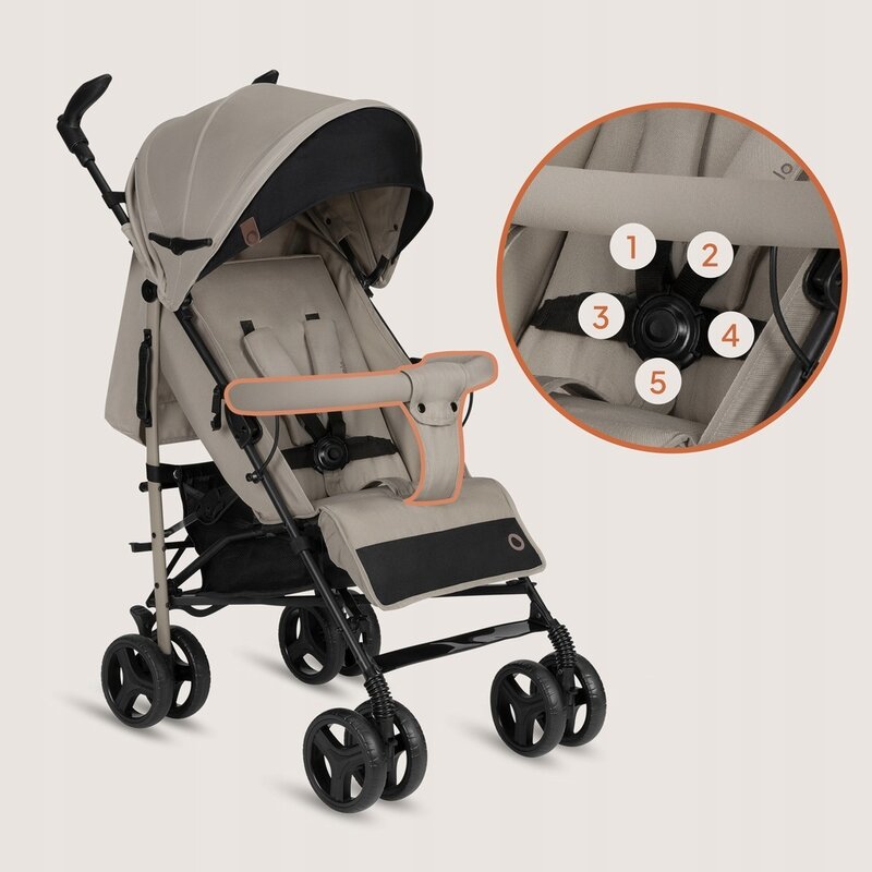 Hamul de siguranta in 5 puncte mentine copilul in pozitie corecta, iar protectiile moi previn iritatiile. Sistemul suplimentar de blocare impiedica plierea accidentala a caruciorului in timpul utilizarii, oferind un plus de siguranta.