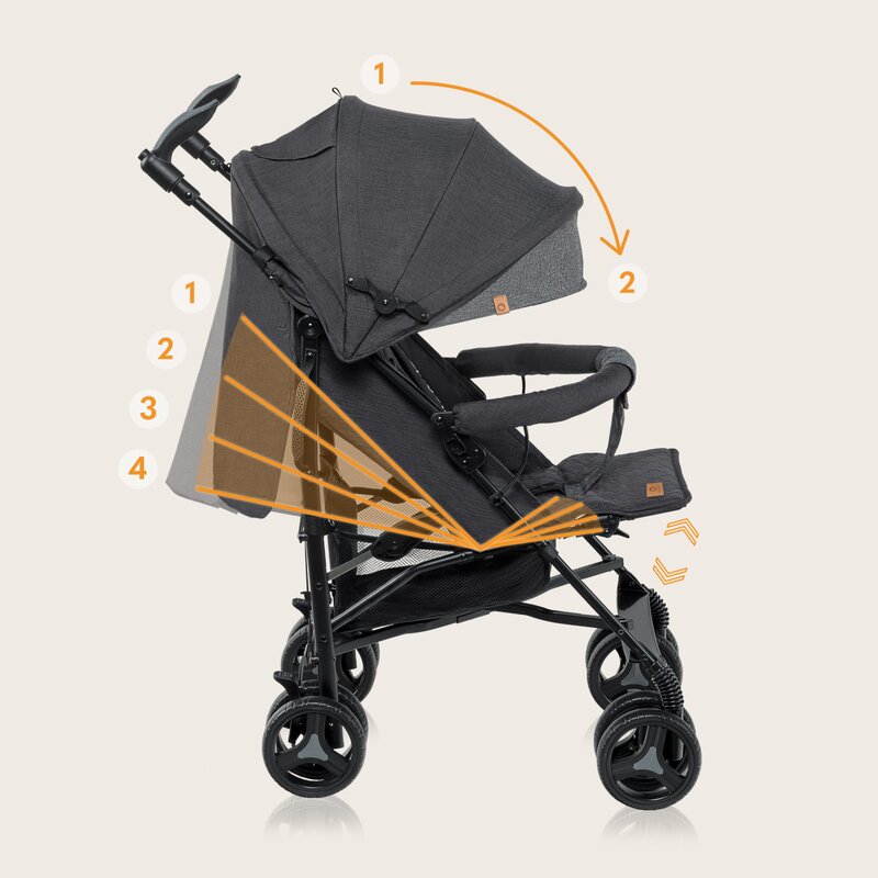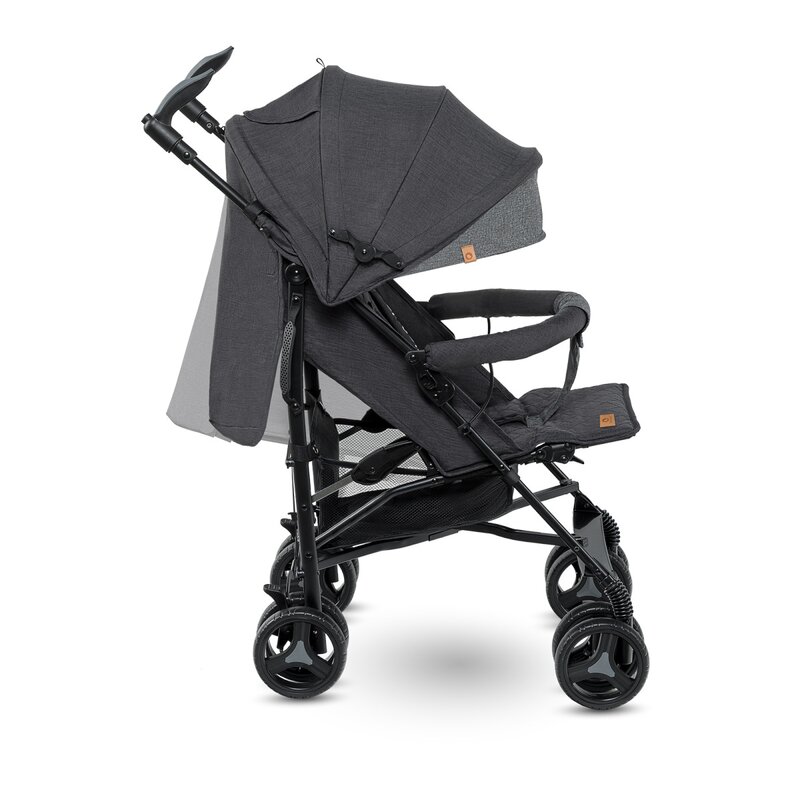 O capotina cu fereastra incorporata si un interior confortabil garanteaza o calatorie fara griji, iar amortizoarele rotilor din fata reduce perceptia socurilor cauzate de terenul denivelat.