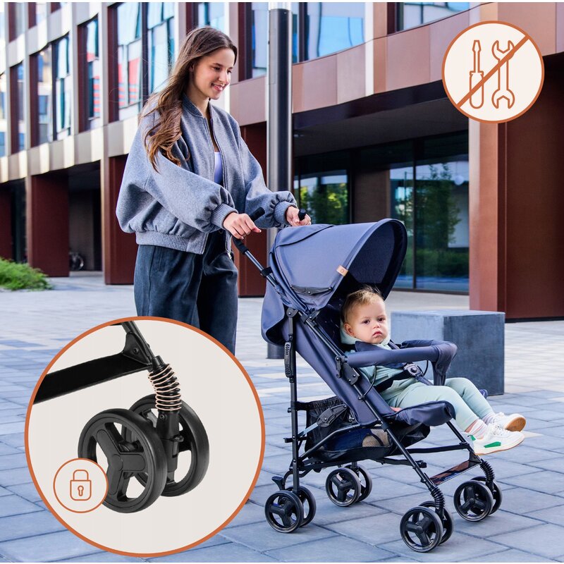 Rotile din spuma EVA sunt rezistente la uzura si nu necesita pompare, oferind o utilizare fara griji. Suspensiile pe rotile din fata asigura o deplasare lina, iar functia de blocare a pivotarii faciliteaza controlul caruciorului pe suprafete dificile sau aglomerate.