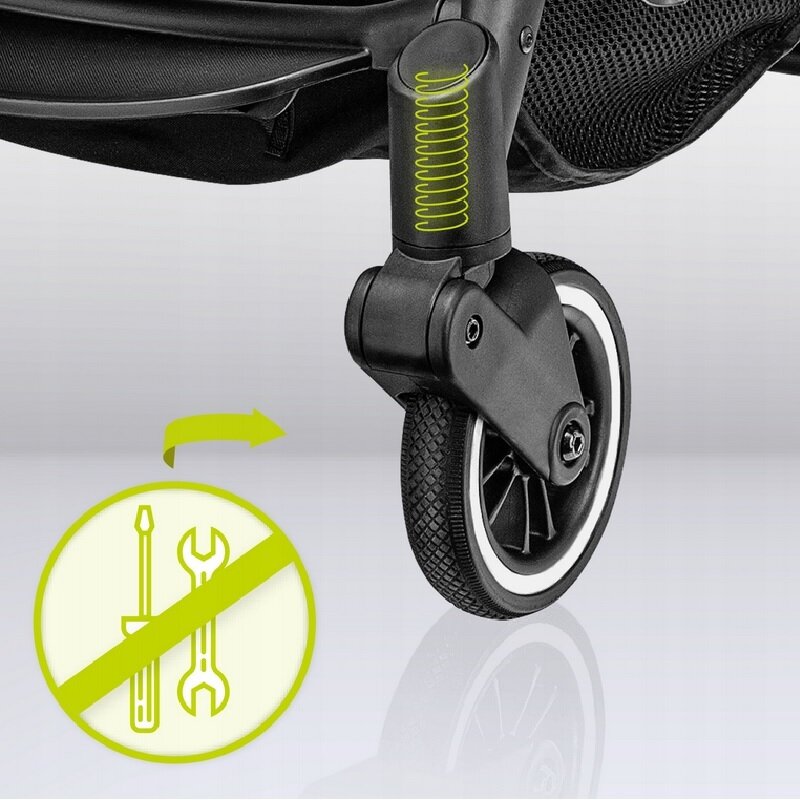 Caruciorul Lionelo Julie One este echipat cu roti fara intretinere cu acoperire de cauciuc PU, care se descurca pe orice drum. Amortizarea fata si spate elimina socurile neplacute pe suprafete neuniforme, iar frana de picior securizeaza pozitia caruciorului in timpul opririi.
