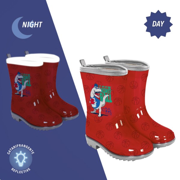 Cizme de ploaie impermeabile pentru copii, cu imprimeu dinozaur si detalii reflectorizante.