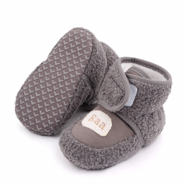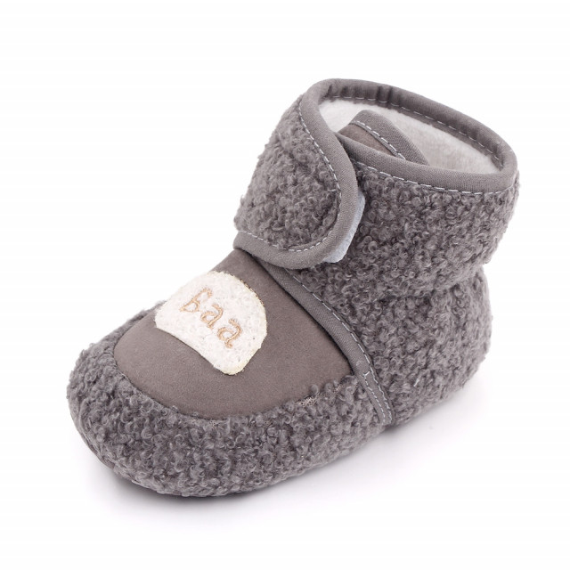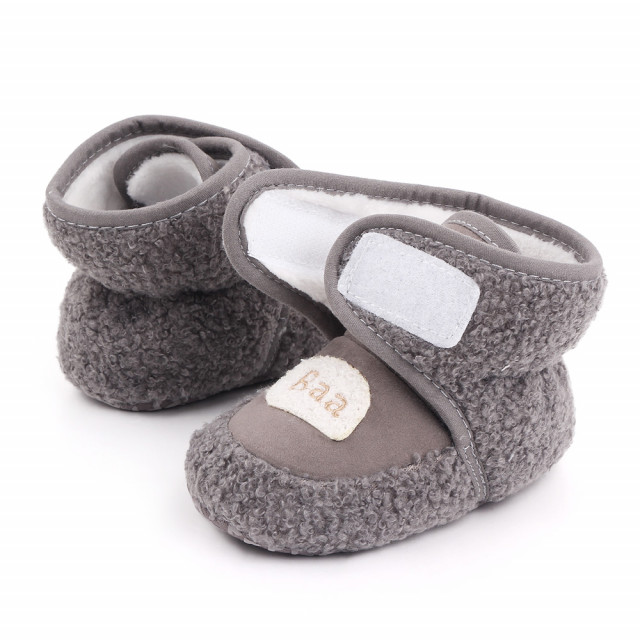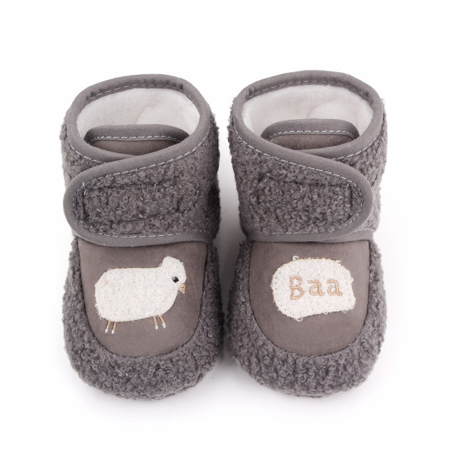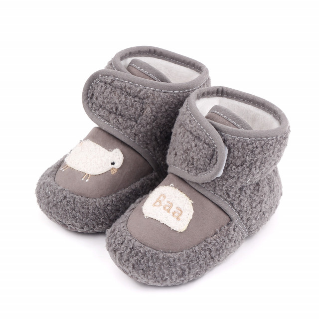 Cizmulite pentru bebelusi, din material textil, cu blanita aplicata si cu o oita si inscriptie "Baa" in fata. Se inchid cu bareta cu arici facilitand incaltarea cu usurinta.