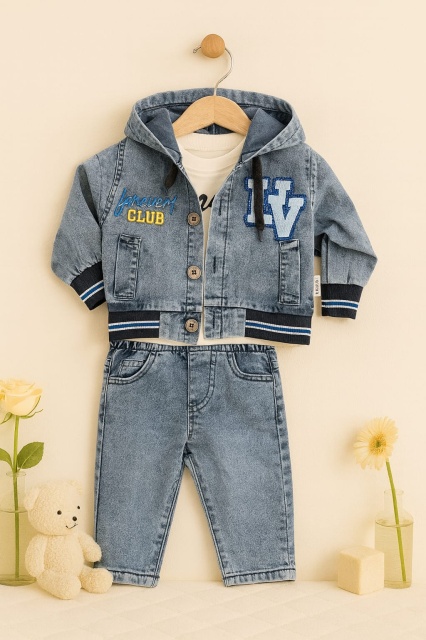 Acest produs Costum baietel din denim Forever Club, 3 piese – jacheta cu gluga, bluza si pantaloni comozi este model TRMB3016