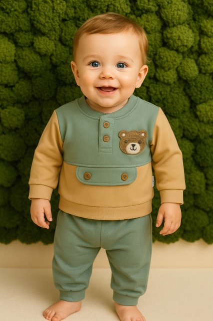 Acest produs Costum Bebelusi Baietel Verde-Bej cu Ursulet – Trening Confortabil din Bumbac pentru Joaca si Plimbari este model AMTR1086