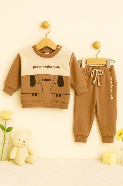 Acest produs Costum bebelusi maro cu mesaj "Peace Begins With a Smile" din doua piese – Bluza si pantaloni comozi este model AMTR57081