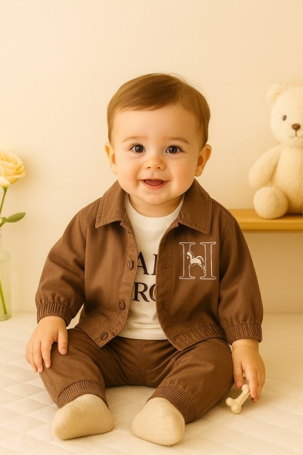 Acest produs Costumas 3 piese cu jacheta maro si pantaloni din denim – outfit elegant si confortabil pentru bebelusi este model TRMD3036
