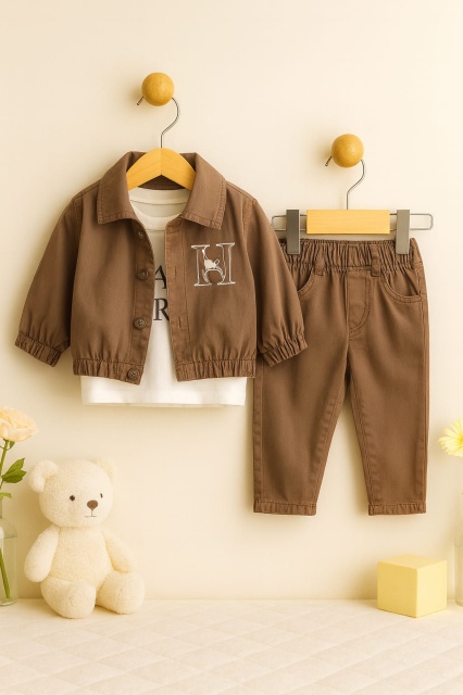 Acest produs Costumas 3 piese cu jacheta maro si pantaloni din denim – outfit elegant si confortabil pentru bebelusi este model TRMD3036