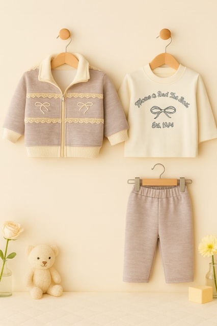 Acest produs Costumas bebelusi 3 piese crem-gri cu dantela si fundite – set elegant si confortabil este model TRMB10029
