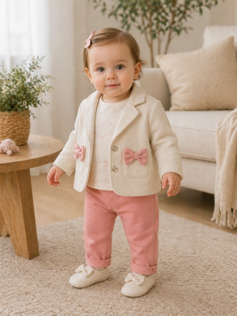 Costumas elegant pentru fetita, format din sacou texturat crem cu fundite, bluza fina si pantaloni roz confortabili. Perfect pentru evenimente, sedinte foto si iesiri speciale.