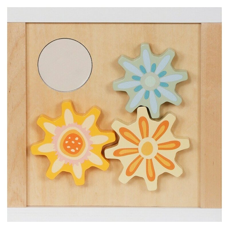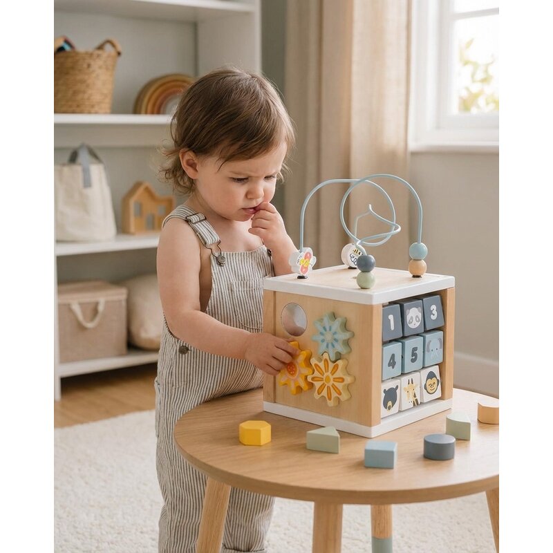 ✔️ Cinco activitati motorii intr-un singur cub – labirint cu bile, forme de potrivit, roti dintate, cuburi cu animale, oglinzi si elemente glisante