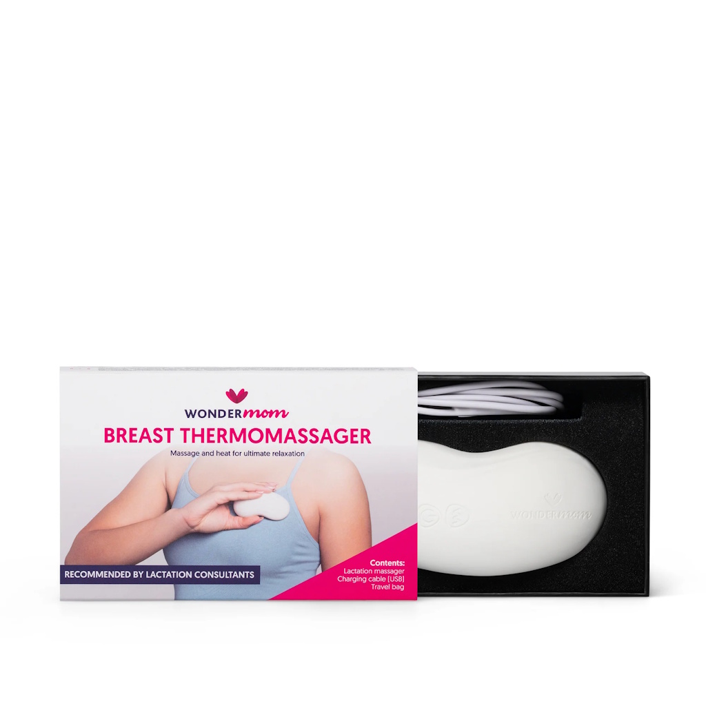 Ideal in perioada alaptarii, fie ca e vorba despre alaptatul la san sau extractia mecanica a laptelui (cu ajutorul pompei de san) Dispozitivul pentru masaj termic Wondermom este conceput special pentru mame, pentru a face alaptarea mai placuta si mai confortabila.  Dispozitivul ofera o relaxare maxima datorita tehnologiei de masaj delicat si caldurii cu intensitate reglabila, pentru a stimula fluxul de lapte. Designul compact si ergonomic permite pozitionarea dispozitivului in interiorul sutienului sau bustierei, devenind astfel ideal pentru utilizare acasa, la serviciu sau in deplasare. Carcasa impermeabila face, de asemenea, ca dispozitivul sa fie sigur pentru utilizare la dus. Poate fi utilizat pentru: Stimularea fluxului de lapte in timpul alaptarii sau pomparii, pentru a sustine tehnicile de compresie a sanilor.Ameliorarea tensiunii si a disconfortului sanilor.Prevenirea si reducerea retentiei de lapte precum si stimularea desfundarii canalelor de lapte blocate.Recomandat de consultantii in lactatie Continut: 1 dispozitiv deTermomasaj pentru sani Wondermom cablu de incarcare (USB) geanta de calatorie Specificatii tehnice: 10 setari diferite ale vibratiilor 3 setari de caldura Alimentare: reincarcabila magnetic prin USB (cablu inclus) Timp de utilizare: pana la 1 ora dupa incarcarea completa Interval de caldură: 38-42 grade Celsius Material: Cauciuc siliconic moale si placut la atingere Rezistent la apa: nivel IPX7 Functiile de masaj si de caldura pot fi utilizate impreuna si separat