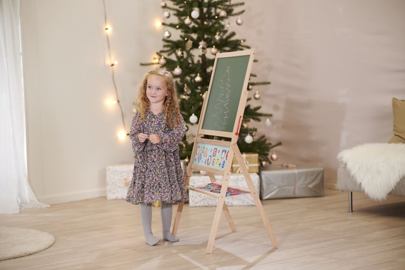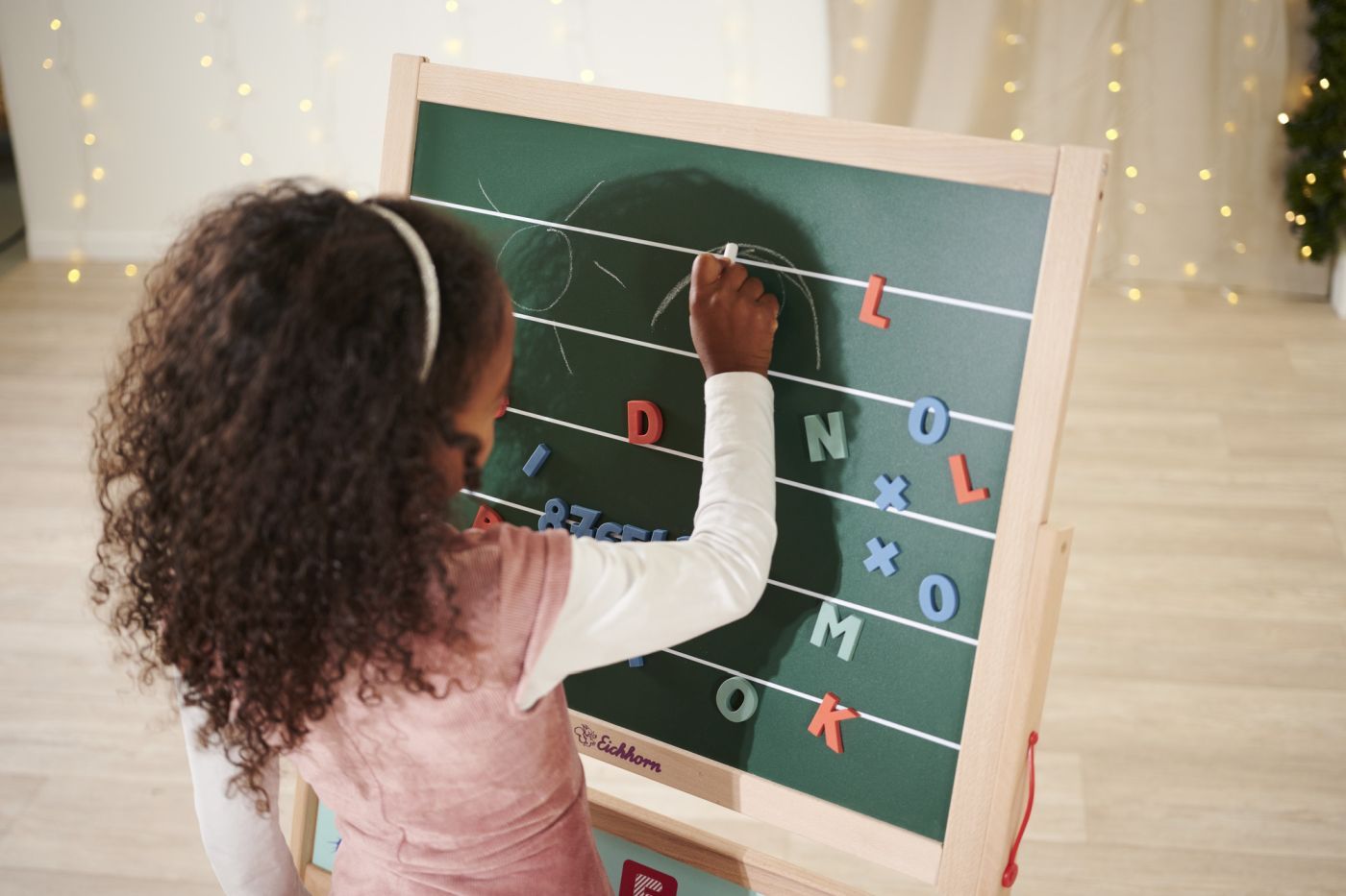Tabla magnetica Eichhorn Tabla magnetica de 66x110 cm, fabricata din lemn de fag de inalta calitate, ofera numeroase functii de joaca si incurajeaza creativitatea. Copiii pot scrie si desena pe tabla cu creta sau pot plasa literele magnetice incluse si o pot folosi ca tabla cu afise. Tabla magnetica Eichhorn are un compartiment practic de depozitare pentru accesorii precum cele 10 creioane colorate, radiera si cele 48 de litere magnetice incluse in set. Potrivita pentru copii cu varsta de 3 ani si peste.
