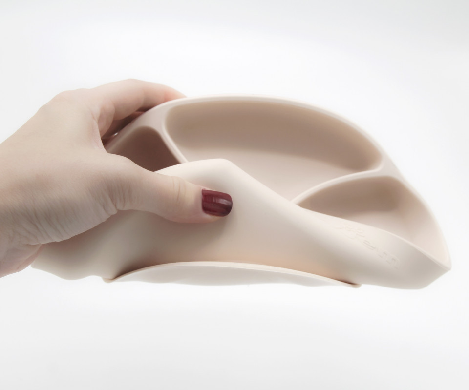 - Se fixeaza si nu aluneca. Baza farfuriei functioneaza ca o ventuza ce impiedica rasturnarea sau alunecarea farfuriei in timpul mesei. Cand doriti sa desprindeti farfuria trebuie doar sa ridicati de marcajul special de pe baza