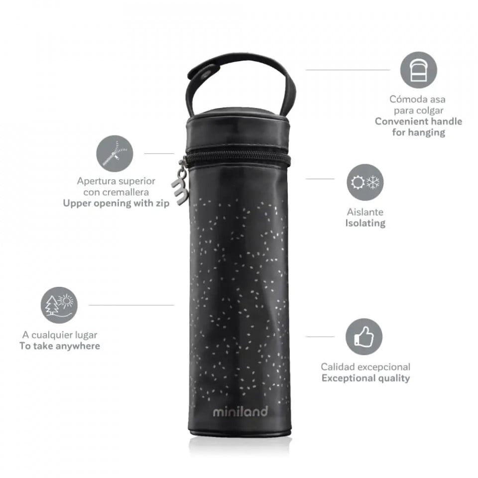 Ajută la menținerea lichidelor la temperatura dorită   Un strat suplimentar de izolație pentru termosuri care le protejează de mediu schimbările de temperatură și ajută la menținerea băuturilor la temperatura potrivită. O geanta pentru termosurile cu lichide de toate dimensiunile Gentile izoterme thermibag au fost special concepute pentru termosuri de 500 ml  și sunt disponibile în modele diferite, astfel încât mamele și tații să poată decora termosurile în culoarea lor preferată. În plus, sunt ideale pentru utilizare împreună cu termosurile Miniland. Materiale rezistente pentru mai multa protectie Fabricat din materiale rezistente, care protejează termosurilor  împotriva zgârieturilor. Are dimensiunea ideală pentru a o lua cu tine oriunde Perfect pentru a fi folosit atunci când ieși la plimbare sau când îți lași copilul la altcineva îngrijire. Geanta are si un maner foarte practic pe care il poti agata de carucior. Deschidere cu fermoar în partea de sus. Există o deschidere cu fermoar în partea de sus a genții izoterme, care poate fi deschisă pentru utilizarea facială a termosului, fără măcar a fi nevoie să-l scoateți.