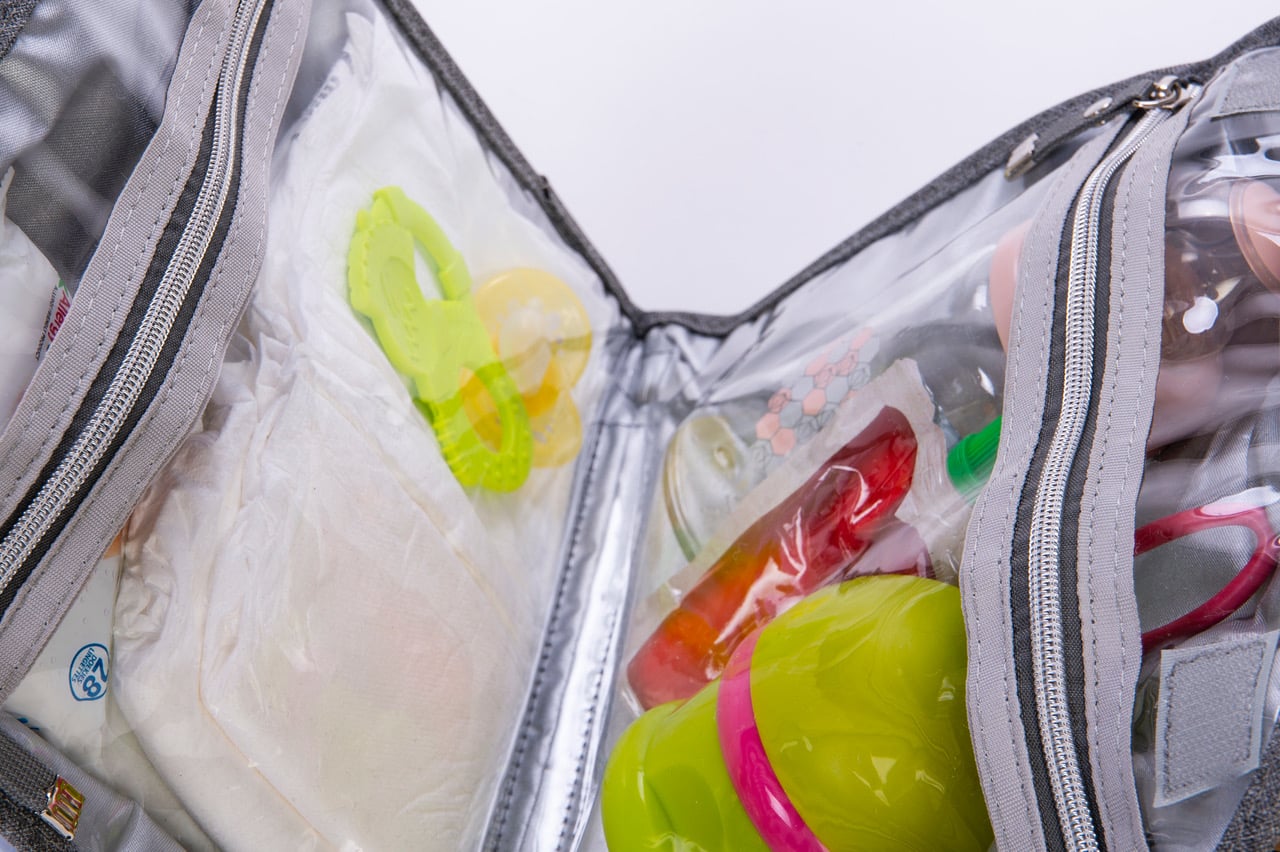 Ca si versiunea Black, Geanta mini bebelusi Baby On Board Miniz Bag Street se deschide larg prin fermoar L, afisand scutece, servetele si crema mini.