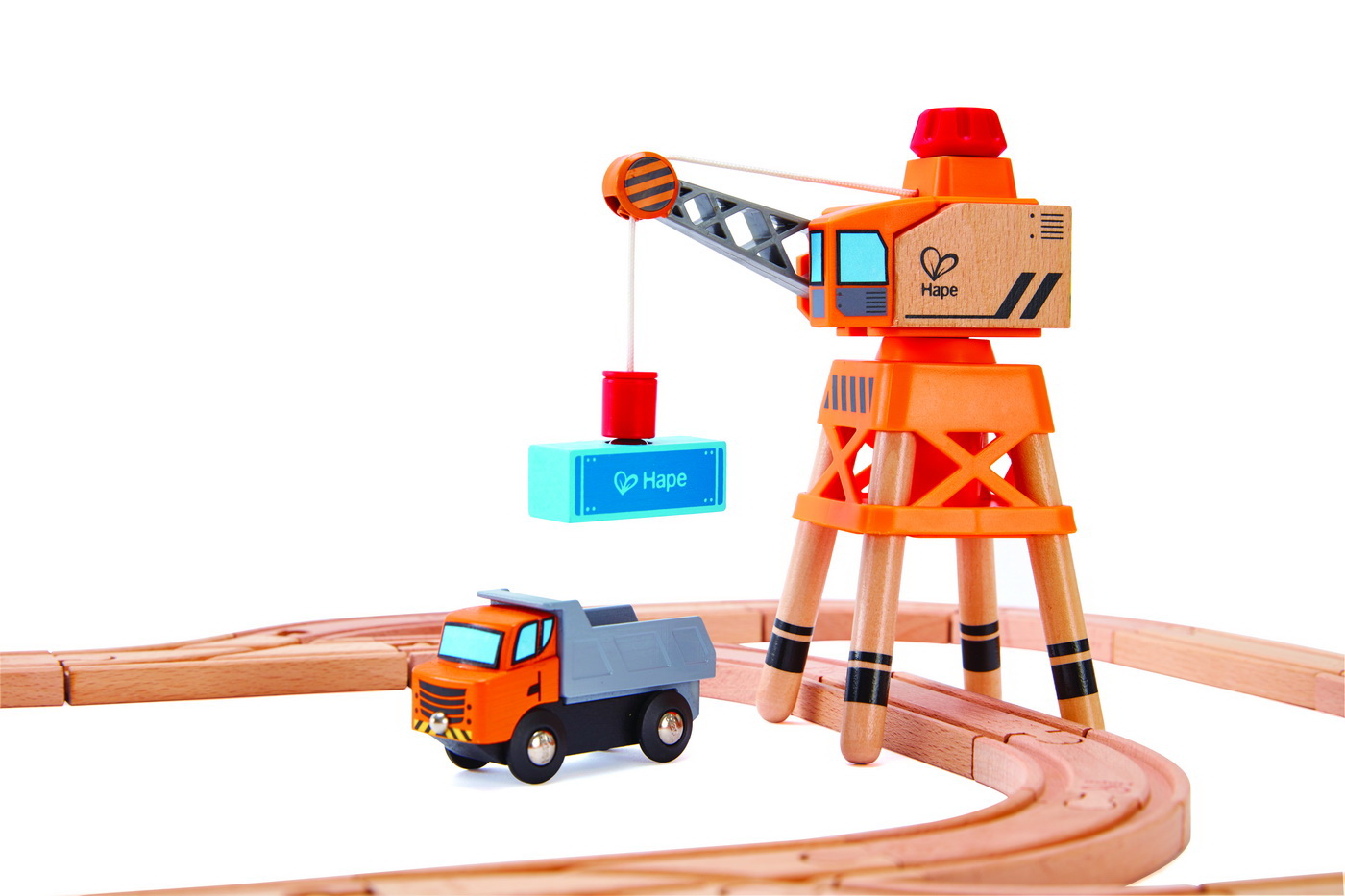 Macara turn Hape cu camion si incarcatura de lemn magnetica. Roteste butonul de pe aceasta macara turn pentru a ridica incarcaturile magnetice sau pentru a le descarca! Bratul macaralei se roteste 360 de grade in timp ce se aud click-urile axului. Picioarele macaralei sunt departate suficient pentru a trece sina de lemn printre ele si trenuletul. Macaraua Hape vine impreuna cu o bascultanta cu incarcatura magnetica. Jucariile sunt realizate din lemn, folosind materiale ecologice, vopsite in culori atragatoare cu vopsele nontoxice, care depasesc cele mai inalte si stricte standarde internationale de siguranta si calitate, precum EN71, ISO9001, ASTM F963 si altele. De multi ani, Hape a creat jucarii fantastice, de inalta calitate, folosind materiale ecologice si durabile, fiecare produs fiind atent proiectat pentru a stimula abilitatile senzoriale, fizice si emotionale.