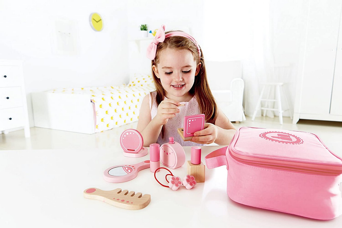 Cuvinte cheie: trusa infrumusetare lemn, joaca de rol, set cosmetic copii, jucarii eco, jucarii siguranta EN71, Hape E3014