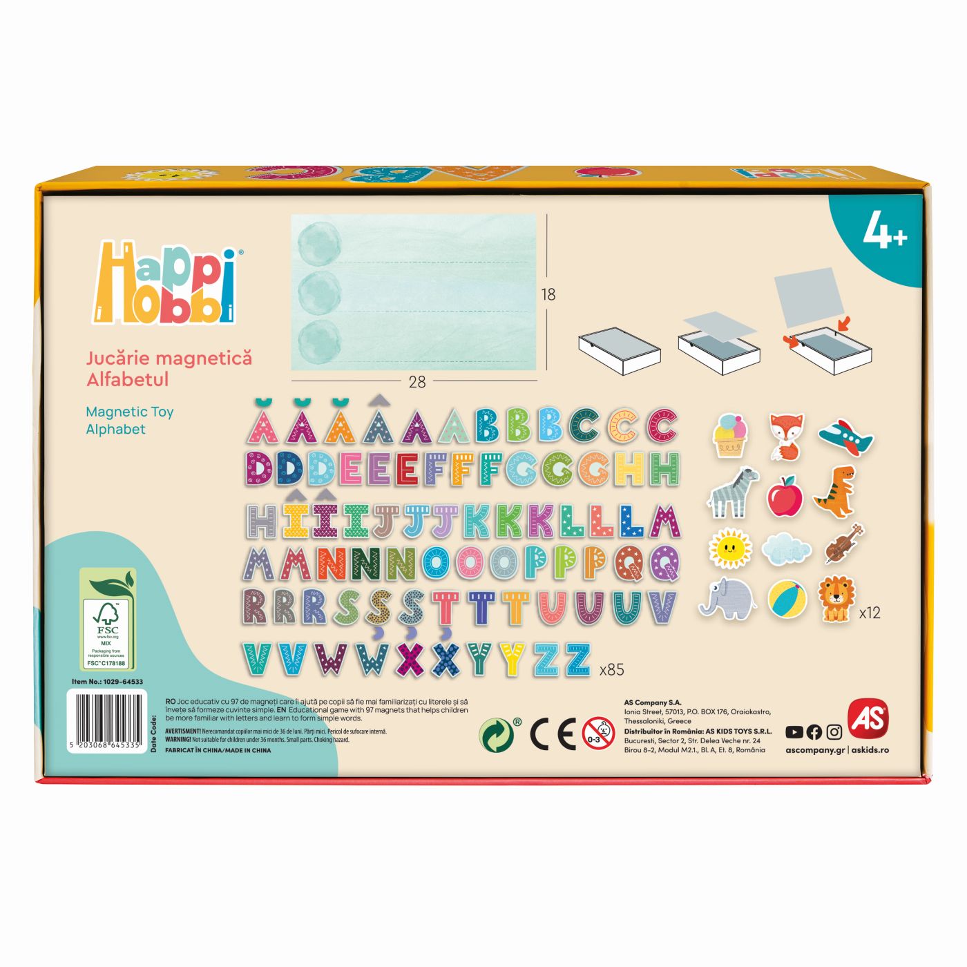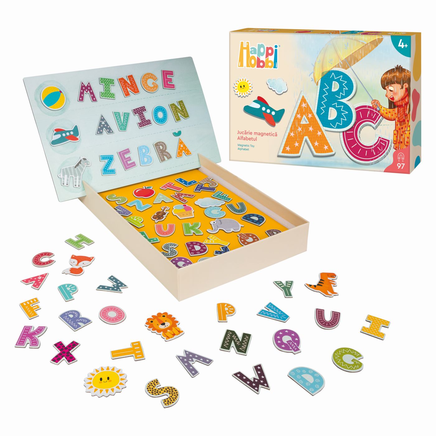 HAPPI HOBBI JUCARIE MAGNETICA ALFABETUL Invata literele intr-un mod distractiv si interactiv cu setul magnetic Happi Hobbi Alfabetul! Copiii pot forma primele lor cuvinte, pot recunoaste literele si isi pot dezvolta vocabularul intr-un mod jucaus. Setul contine 97 de piese magnetice colorate, perfecte pentru mainile mici, care pot fi atasate pe orice suprafata metalica. Jocul stimuleaza recunoasterea literelor, coordonarea mana-ochi, atentia si creativitatea. Ideal pentru copiii de peste 4 ani, acest set transforma invatarea alfabetului intr-o activitate educativa si plina de voie buna. Varsta recomandata 4+.