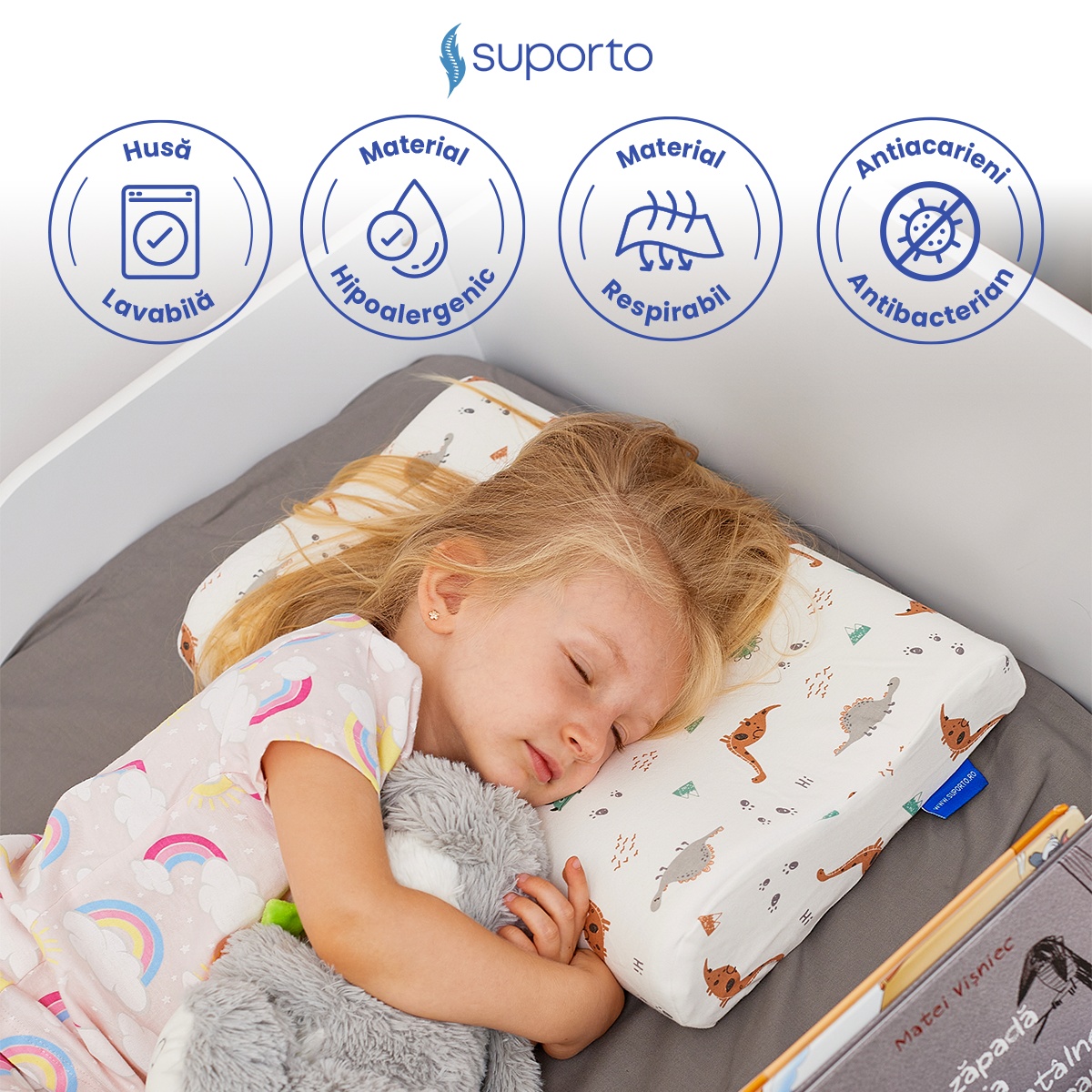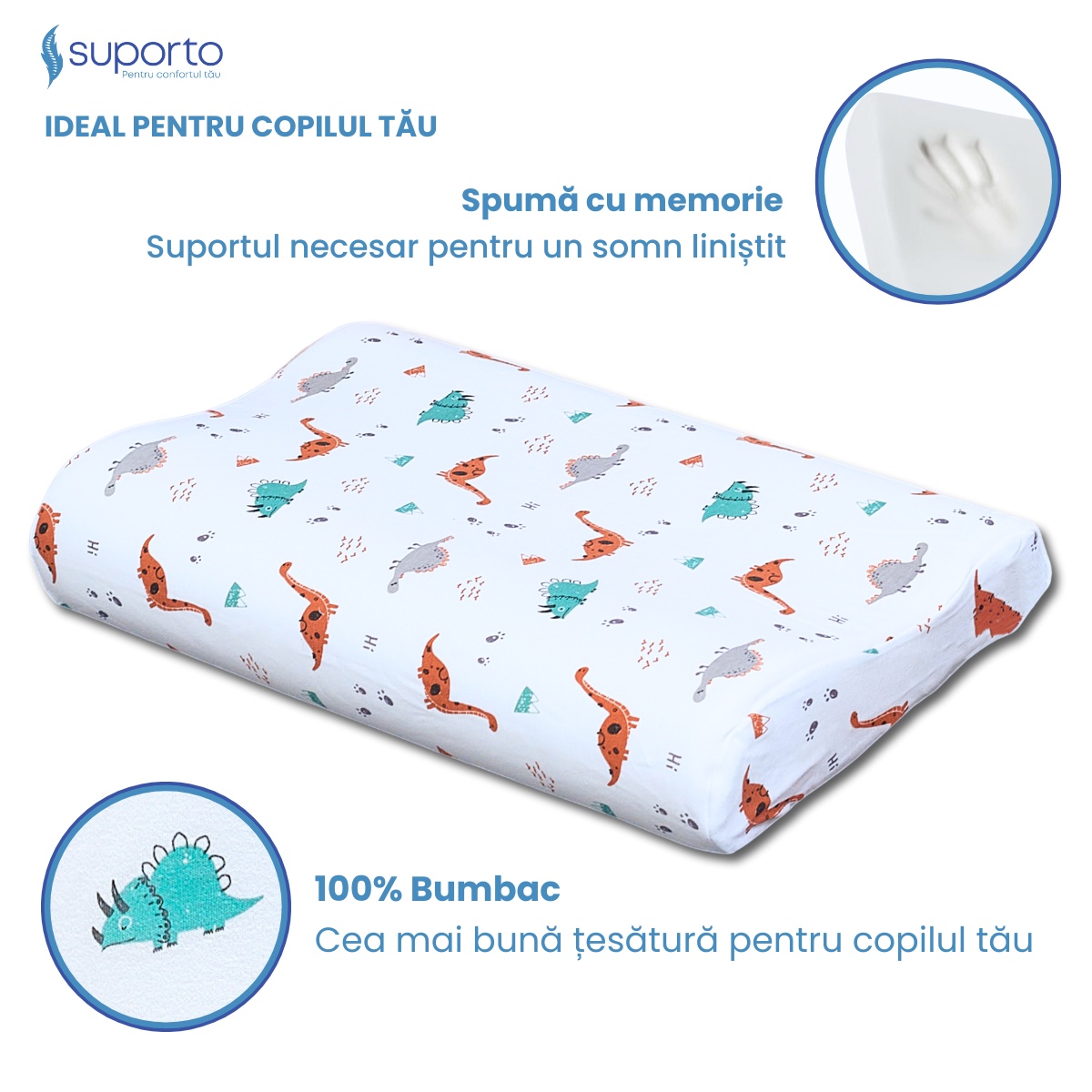 Husa de schimb pentru Perna ortopedica pentru copii Suporto Toddler - Model Dinozauri, 2 - 9 ani, din spuma cu memorie. Husa se potriveste pentru acest model de Perna pentru copii: ???? Link Pernă Fata de pernă multicoloră din bumbac 100% este un produs de înaltă calitate, conceput special pentru a asigura igienă copiilor în timpul somnului lor. Această față de pernă are o serie de caracteristici și beneficii care o fac o alegere excelentă pentru părinți. Husă hipoalergenică și lavabilă: Husa pernei este hipoalergenică, ceea ce o face potrivită pentru copiii cu piele sensibilă sau alergii. De asemenea, husa este lavabilă, ceea ce înseamnă că o poți curăța ușor și o poți menține curată și proaspătă. Husă respirabilă: Materialul din bumbac 100% permite pernei să fie respirabilă, asigurând o circulație adecvată a aerului. Aceasta previne acumularea de căldură și umiditate, asigurând un mediu confortabil și răcoros pentru copilul tău. Material din bumbac 100%: Fata de pernă este fabricată integral din bumbac, un material natural și moale. Bumbacul este cunoscut pentru proprietățile sale de a fi delicat cu pielea sensibilă a copiilor și oferă o senzație plăcută la atingere. Ușor de curățat și de schimbat: Husa pernei este ușor de curățat și de înlocuit. Poți spăla husa în mașina de spălat conform instrucțiunilor de îngrijire, ceea ce facilitează menținerea igienei și proaspătății pernei. Anti Acarieni: Această față de pernă este tratată pentru a fi rezistentă la acarieni, ceea ce contribuie la menținerea unui mediu curat și sănătos pentru copilul tău. Fermoar invizibil: Fata de pernă este prevăzută cu un fermoar invizibil, care nu doar asigură o închidere sigură, ci și conferă un aspect estetic plăcut pernei. Fără miros: Fata de pernă nu are miros neplăcut, asigurând un mediu curat și proaspăt pentru copilul tău. Fata de pernă din bumbac 100% oferă un pachet complet de beneficii pentru copilul tău. De la husa hipoalergenică și lavabilă, până la materialul respirabil și confortabil din bumbac, această față de pernă este proiectată pentru a oferi confort și igienă în timpul somnului copilului tău. Adițional, durabilitatea și designul atrăgător fac din această fata de pernă o alegere excelentă pentru a completa decorul camerei copilului. Dimensiuni: Lungimea: 45 cm Lățimea: 25 cm Înălțimea: 5 cm Forma ortopedica ajuta la pozitionarea corecta a capului in timpul somnului. De asemenea, perna ajuta la modelarea formei capului copilului. Perna ortopedica a fost conceputa pentru a face copilul să se simtă ușor și vesel după somn, sa se trezeasca odihnit si sa se dezvolte corespunzator. Ofera-i copilului tau o perna ortopedica de calitate pentru o dezvoltare armonioasa! GARANȚII SUPORTO: Livrare rapidă sau banii înapoi Îți promitem livrare rapidă prin curier rapid în maxim 2 zile lucrătoare * pe tot teritoriul României sau îți returnăm de 2 ori banii pentru transport. *suma se va returna în contul bancar sau se va emite un voucher echivalent, la alegere *valabil pentru tot parcursul anului cu excepția perioadei care cuprinde Black Friday și Crăciun 10 noi. - 25 dec. Garantie: 24 luni Perioada de retur: 14 zile. Perioada de retur extinsa pana la 60 zile pentru acest produs, vezi in ce conditii aici.