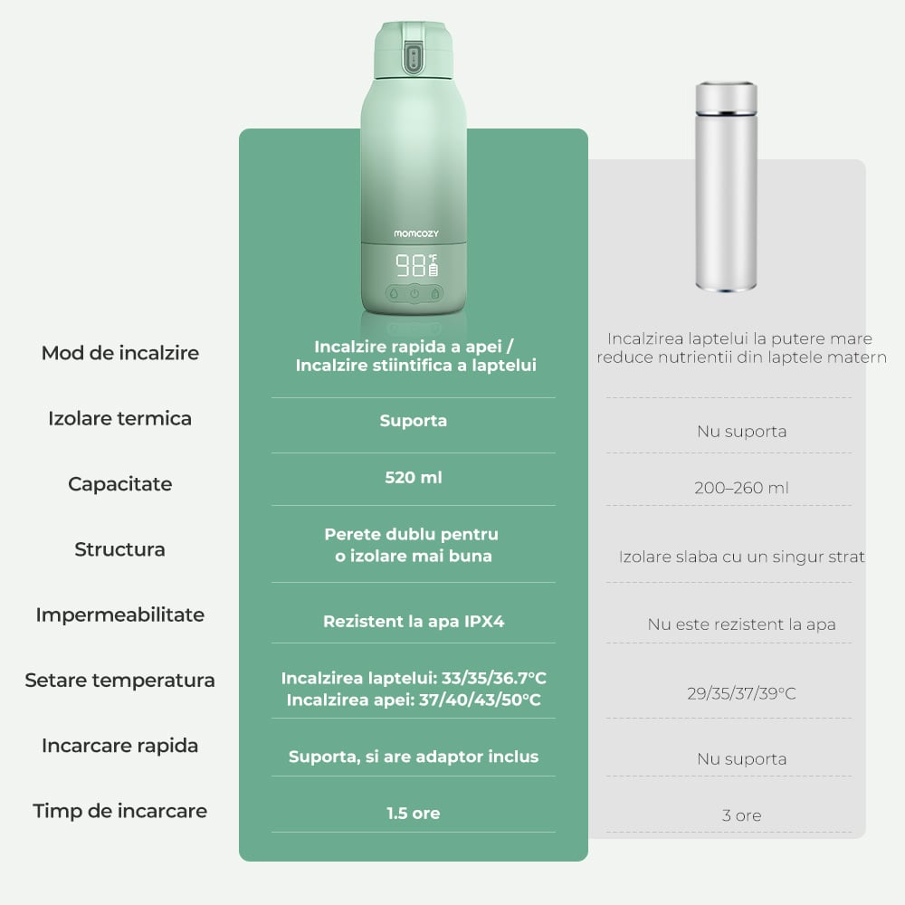 Formatul tip termos cu etansari multiple previne scurgerile in geanta, iar afisajul de temperatura (LED/LCD) simplifica monitorizarea si ajustarea. Carcasa compacta si greutatea redusa fac transportul facil, iar utilizarea cu o singura mana iti permite sa pregatesti rapid biberonul chiar si in miscare. Incalzitor portabil Momcozy pentru lapte si apa pentru calatori pastreaza lichidele in interior in siguranta si elimina nevoia de cani cu apa fierbinte sau prize.