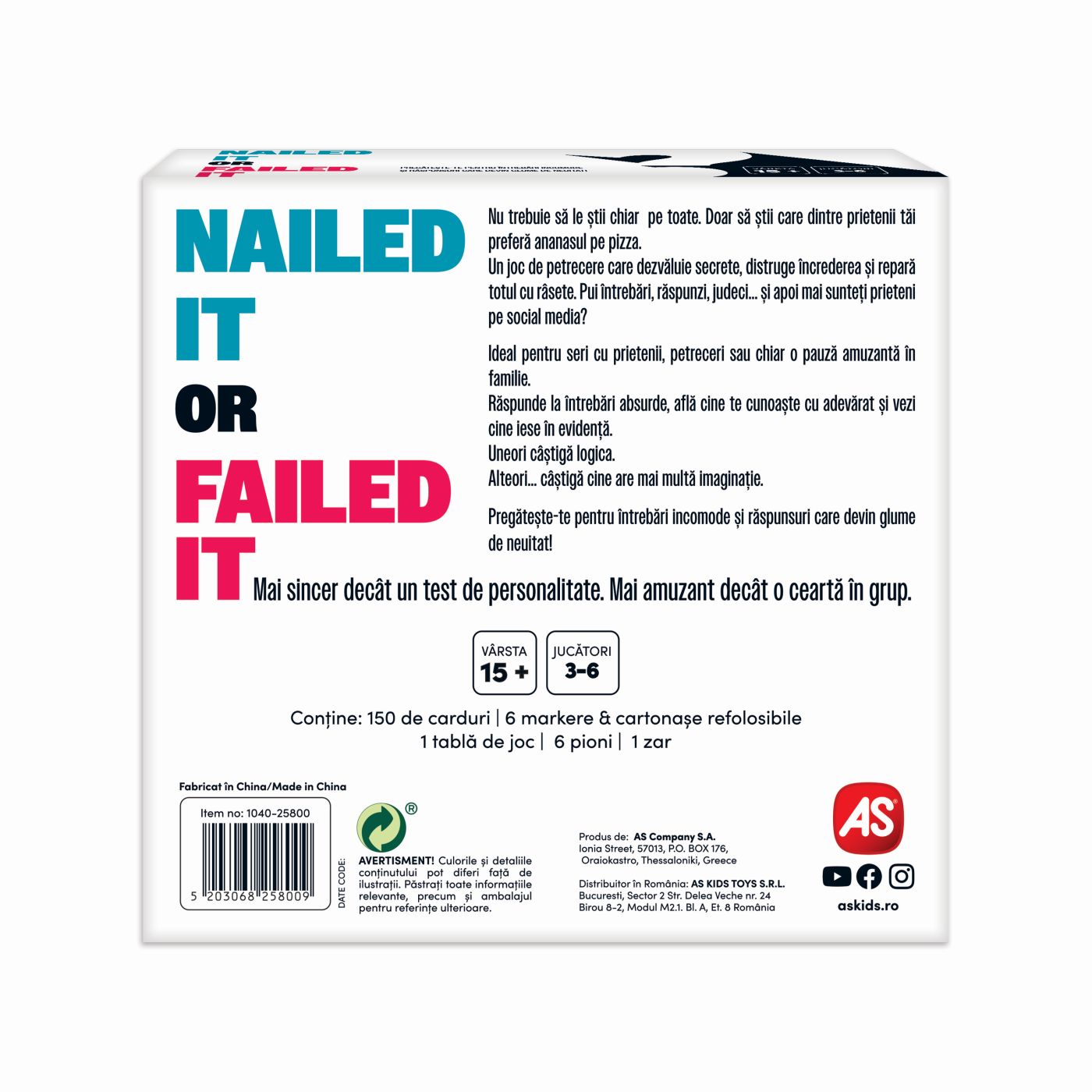 Jocul de societate Nailed it or Failed it, este ideal pentru seri distractive cu prietenii, petreceri sau chiar pentru o pauza amuzanta in familie. Raspunde la intrebari absurde, descopera cine te cunoaste cu adevarat si vezi cine reuseste sa iasa in evidenta cu cele mai neasteptate raspunsuri. 95049080 Uneori castiga logica. Alteori... castiga imaginatia!