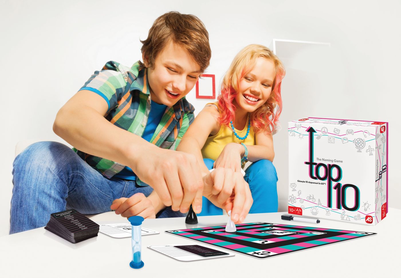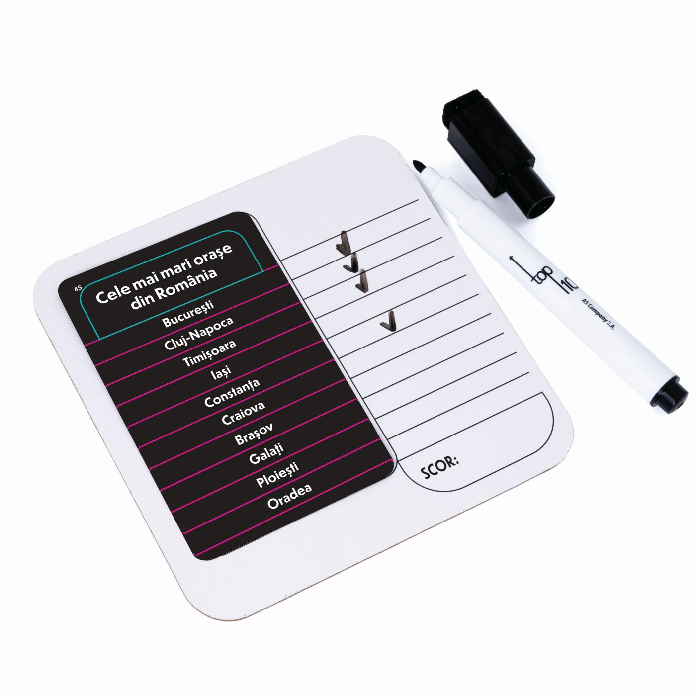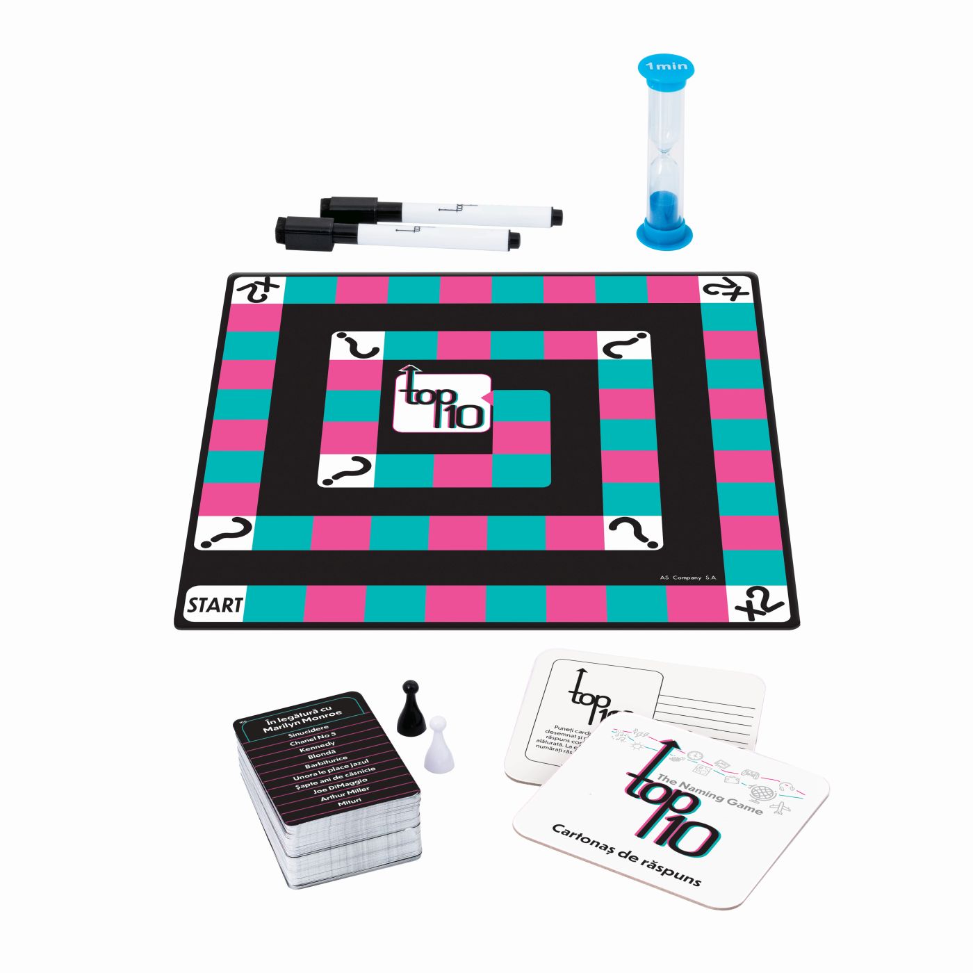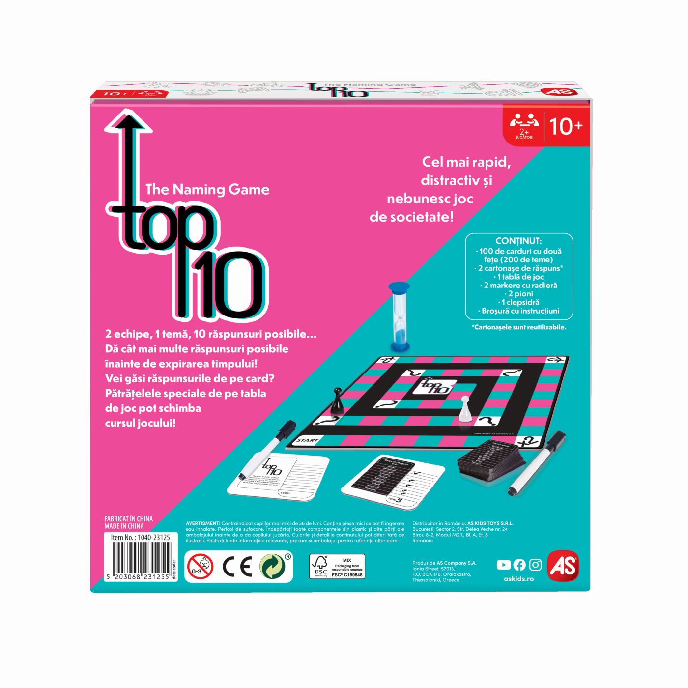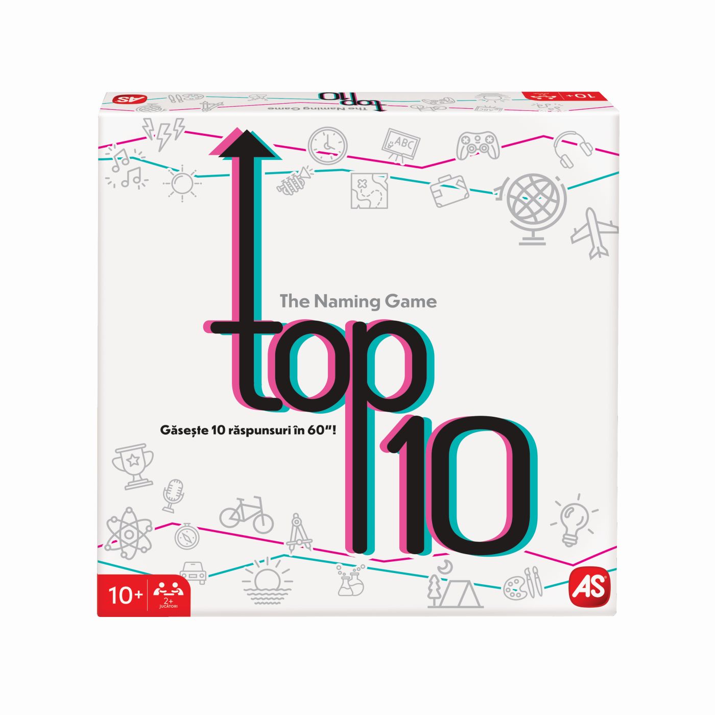 Joc de societate Top 10 in limba Romana. Gaseste 10 raspunsuri in 60 de secunde! Un joc de cultura generala plin de dinamism si distractie, perfect pentru intreaga familie. Fiecare runda te provoaca sa raspunzi rapid si corect la cat mai multe teme, testandu-ti atentia, gandirea si viteza de reactie. Contine 100 de carduri cu doua fete (200 de teme), 2 cartonase de raspuns*, 1 tabla de joc, 2 markere cu radiera, 2 pioni, 1 clepsidra. Un joc competitiv si amuzant care stimuleaza memoria si gandirea rapida cine reuseste sa gaseasca cele 10 raspunsuri inainte ca timpul sa se scurga?