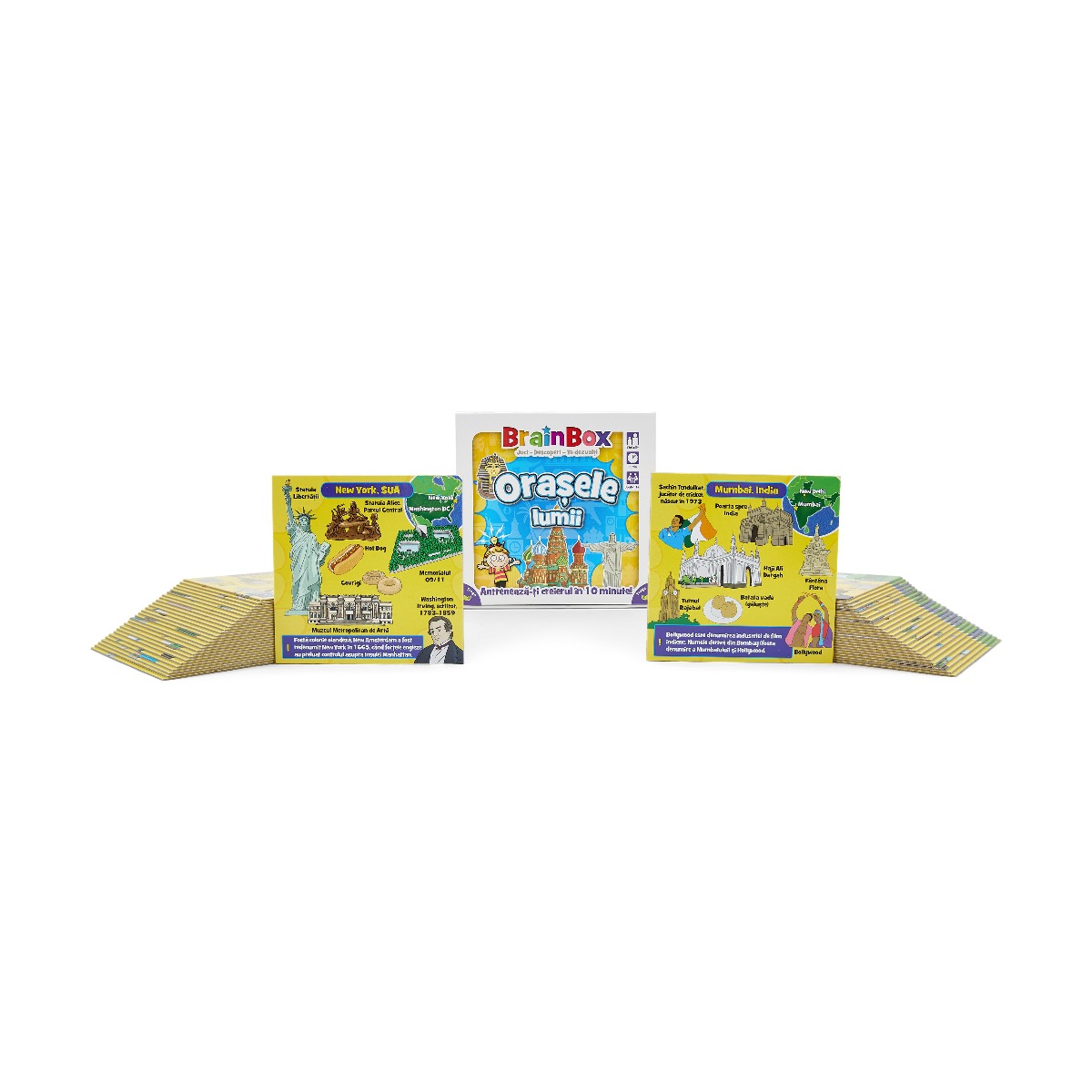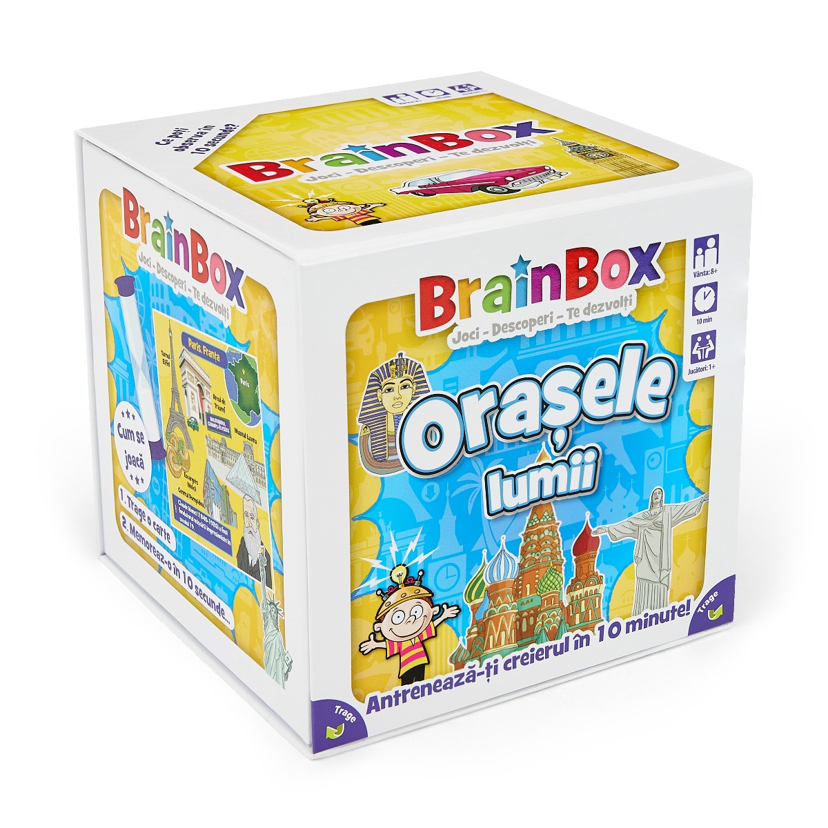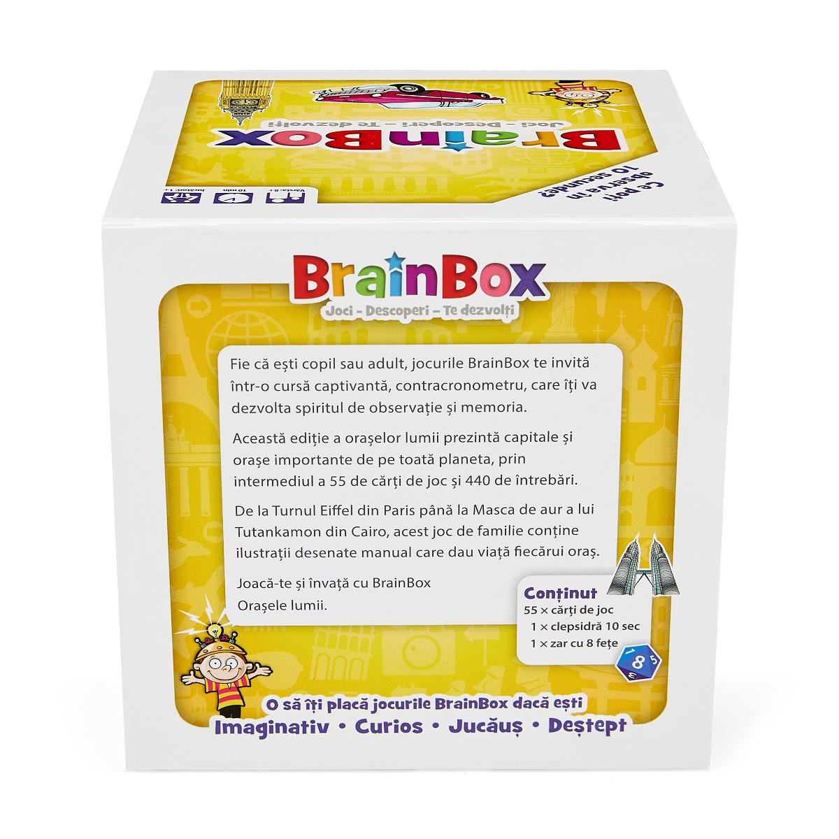 BrainBox Orasele lumii - Joc distractiv si educativ pentru copii peste 8 ani BrainBox este un joc de carti distractiv, de memorie si observatie, care testeaza atentia pentru detalii. Ce va puteti aminti in doar 10 secunde? Aceasta editie cu orasele lumii are metropole din Africa, Asia, Europa si Americi. BrainBox Orasele lumii contine 55 de carti de joc cu orase de pe tot globul, de la Atena la Auckland, de la Lagos la Londra si de la Manila la Mexico City. Fiecare carte include ilustratii de mâna care dau viata oraselor, cu detalii despre cultura, atractii turistice, istorie si altele. Jocul va ajuta copiii sa invete despre lumea din jur, dezvoltând totodata competentele cognitive de observatie si rememorare, care stau la baza invatarii pe tot parcursul vietii. CU ORASE DIN LUME:testati-va memoria si spiritul de observatie cu o aventura in jurul lumii. In ce oras puteti traversa podul Bosfor, care leaga Europa de Asia? Sau merge cu gondola pe Muntele Masa? 440 DE INTREBARI DE CALATORIE: va puteti bucura de un joc in doar 5 sau 10 minute, dar datorita sutelor de intrebari puteti petrece ore intregi de distractie si niciun joc nu va semana cu celelalte JOC INDIVIDUAL SAU IN FAMILIE: jucati singuri sau cu familia si prietenii. Provocarea este simpla: cât de mult va puteti aminti de pe cartea aleasa in doar 10 secunde DISTRACTIV SI EDUCATIV: BrainBox este creat pentru a fi distractiv, oferind totodata un antrenament pentru memorie, gratie intrebarilor bazate pe memorie si observatie JOCUL CONTINE: 55 de carti de joc cu 440 de intrebari individuale, 1 carte cu regulile de joc, 1 clepsidra ce masoara zece secunde, 1 zar cu 8 fete