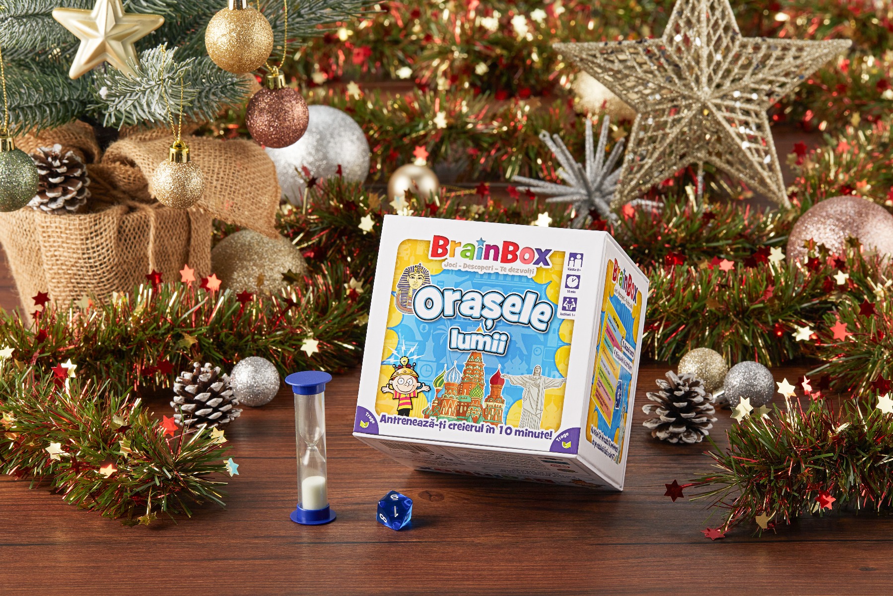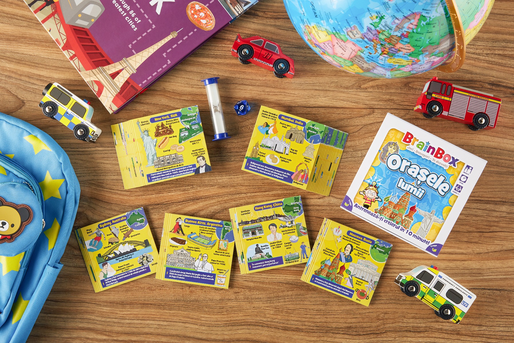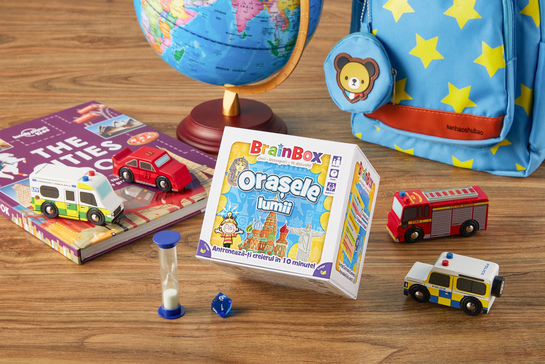 BrainBox Orasele lumii - Joc distractiv si educativ pentru copii peste 8 ani BrainBox este un joc de carti distractiv, de memorie si observatie, care testeaza atentia pentru detalii. Ce va puteti aminti in doar 10 secunde? Aceasta editie cu orasele lumii are metropole din Africa, Asia, Europa si Americi. BrainBox Orasele lumii contine 55 de carti de joc cu orase de pe tot globul, de la Atena la Auckland, de la Lagos la Londra si de la Manila la Mexico City. Fiecare carte include ilustratii de mâna care dau viata oraselor, cu detalii despre cultura, atractii turistice, istorie si altele. Jocul va ajuta copiii sa invete despre lumea din jur, dezvoltând totodata competentele cognitive de observatie si rememorare, care stau la baza invatarii pe tot parcursul vietii. CU ORASE DIN LUME:testati-va memoria si spiritul de observatie cu o aventura in jurul lumii. In ce oras puteti traversa podul Bosfor, care leaga Europa de Asia? Sau merge cu gondola pe Muntele Masa? 440 DE INTREBARI DE CALATORIE: va puteti bucura de un joc in doar 5 sau 10 minute, dar datorita sutelor de intrebari puteti petrece ore intregi de distractie si niciun joc nu va semana cu celelalte JOC INDIVIDUAL SAU IN FAMILIE: jucati singuri sau cu familia si prietenii. Provocarea este simpla: cât de mult va puteti aminti de pe cartea aleasa in doar 10 secunde DISTRACTIV SI EDUCATIV: BrainBox este creat pentru a fi distractiv, oferind totodata un antrenament pentru memorie, gratie intrebarilor bazate pe memorie si observatie JOCUL CONTINE: 55 de carti de joc cu 440 de intrebari individuale, 1 carte cu regulile de joc, 1 clepsidra ce masoara zece secunde, 1 zar cu 8 fete
