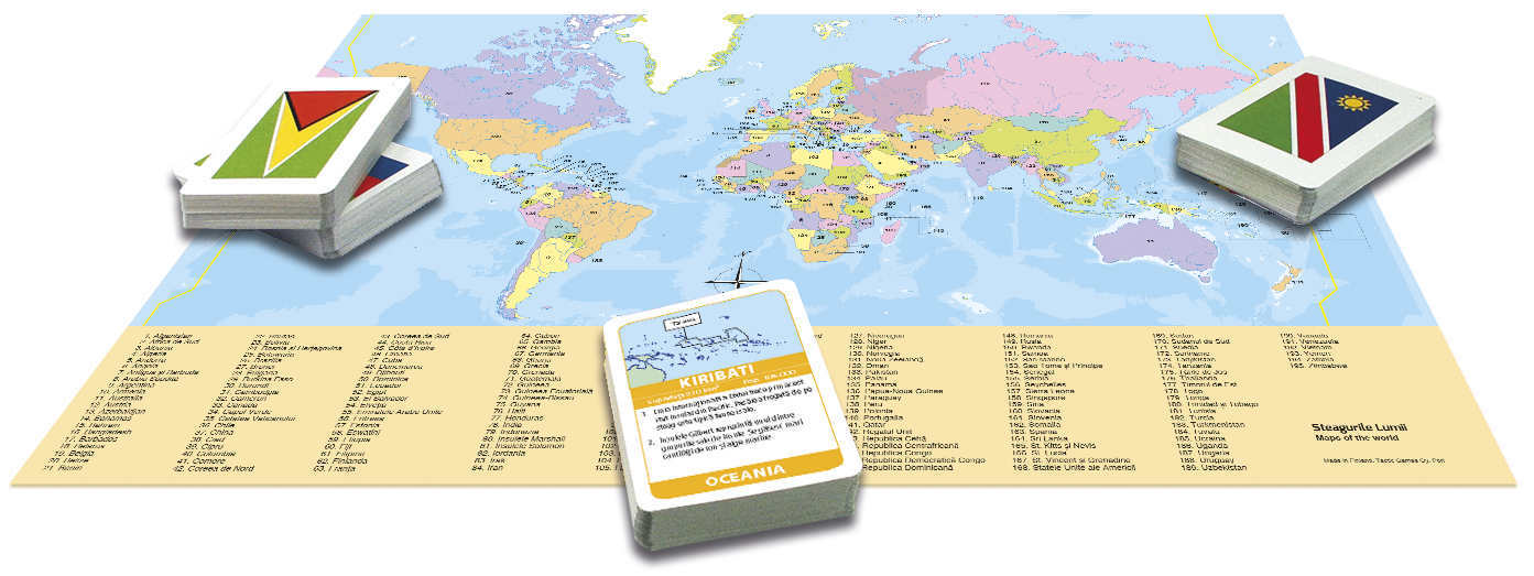 Porniti Intr-o calatorie In jurul lumii si Invatati despre diferite steaguri, tari, capitale si multe, multe altele! Steagurile sunt simboluri nationale ce pot uni oamenii si pot comunica atunci cand cuvintele dau gres. Jocul Steagurile lumii contine 200 de carti de joc, pline de informatii, Intrebari fascinante despre diverse tari si caracteristicile lor principale, dar si o harta a lumii. Steagurile lumii este un joc educativ tip Trivia, ce se poate juca in 2-6 jucatori Incepand cu varsta de 8 ani.