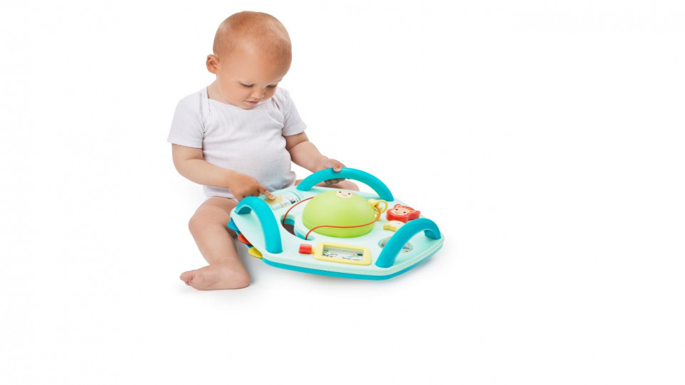 -3 labirinturi de margele, inclusiv unul care traverseaza jucaria pentru a dezvolta abilitatile motorii fine ale bebelusului tau.