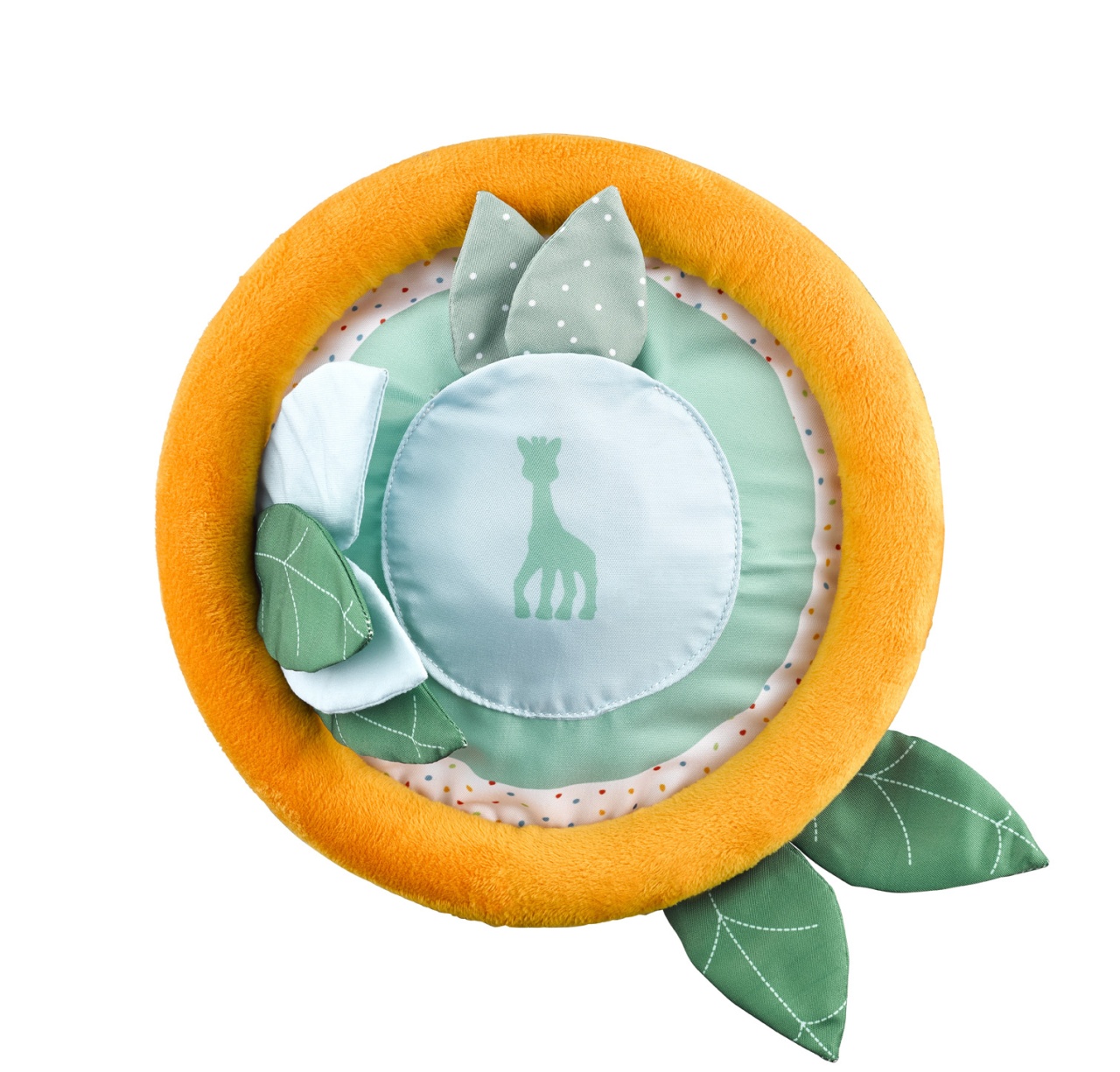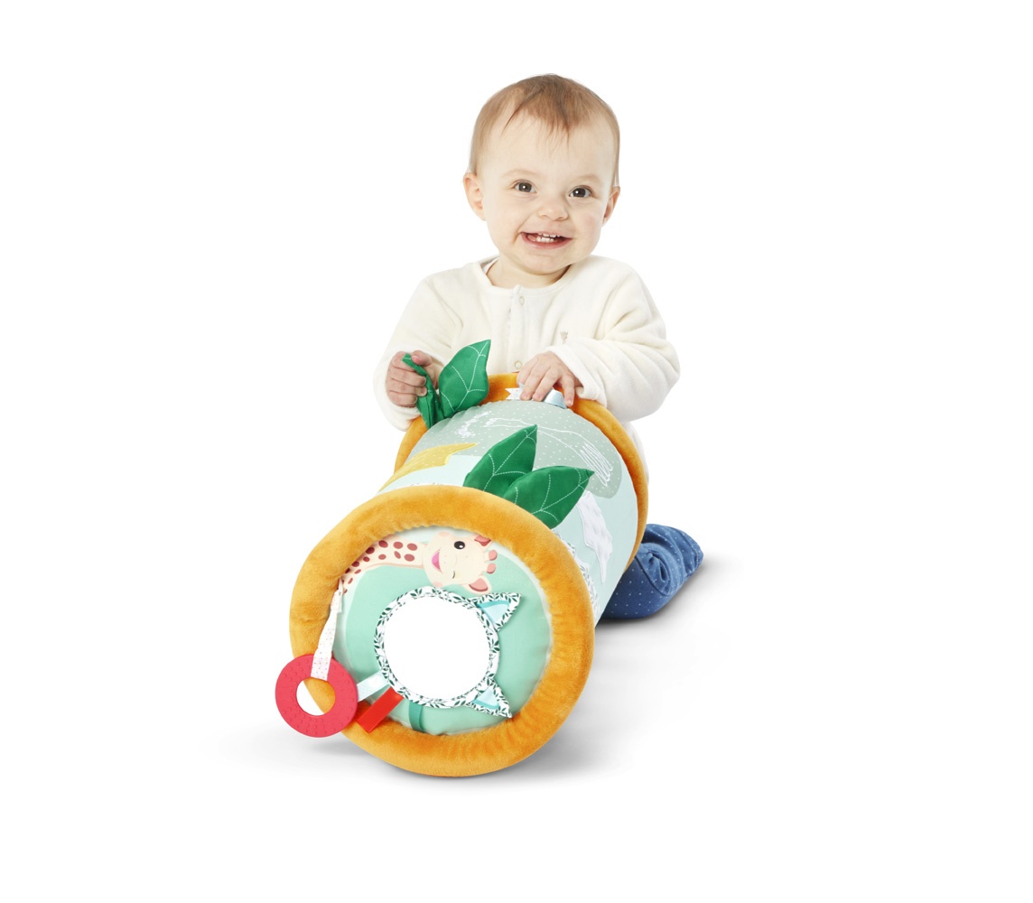 Jucaria Rollin’ are mai multe fatete cu urmatoarele activitati pentru stimularea simturilor copilasului: oglinda, bilute sonore, hartie fosnitoare, inel texturat de dentitie. Jucaria este foarte usoara ca greutate (fiind gonflabila) si simplu de transportat.