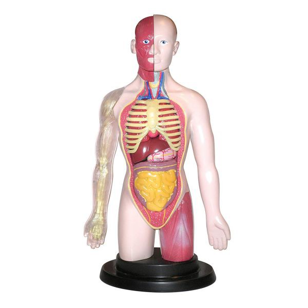 Kitul include: mulajul corpului uman cu o dimensiune de 37 cm, 16 piese detasabile suport din plastic pentru mulaj, roata calorica, carduri despre vitamine si nutrienti, un poster al corpului uman, un certificat si un ghid. Organele sunt detașabile Materiale: plastic si carton / hartie