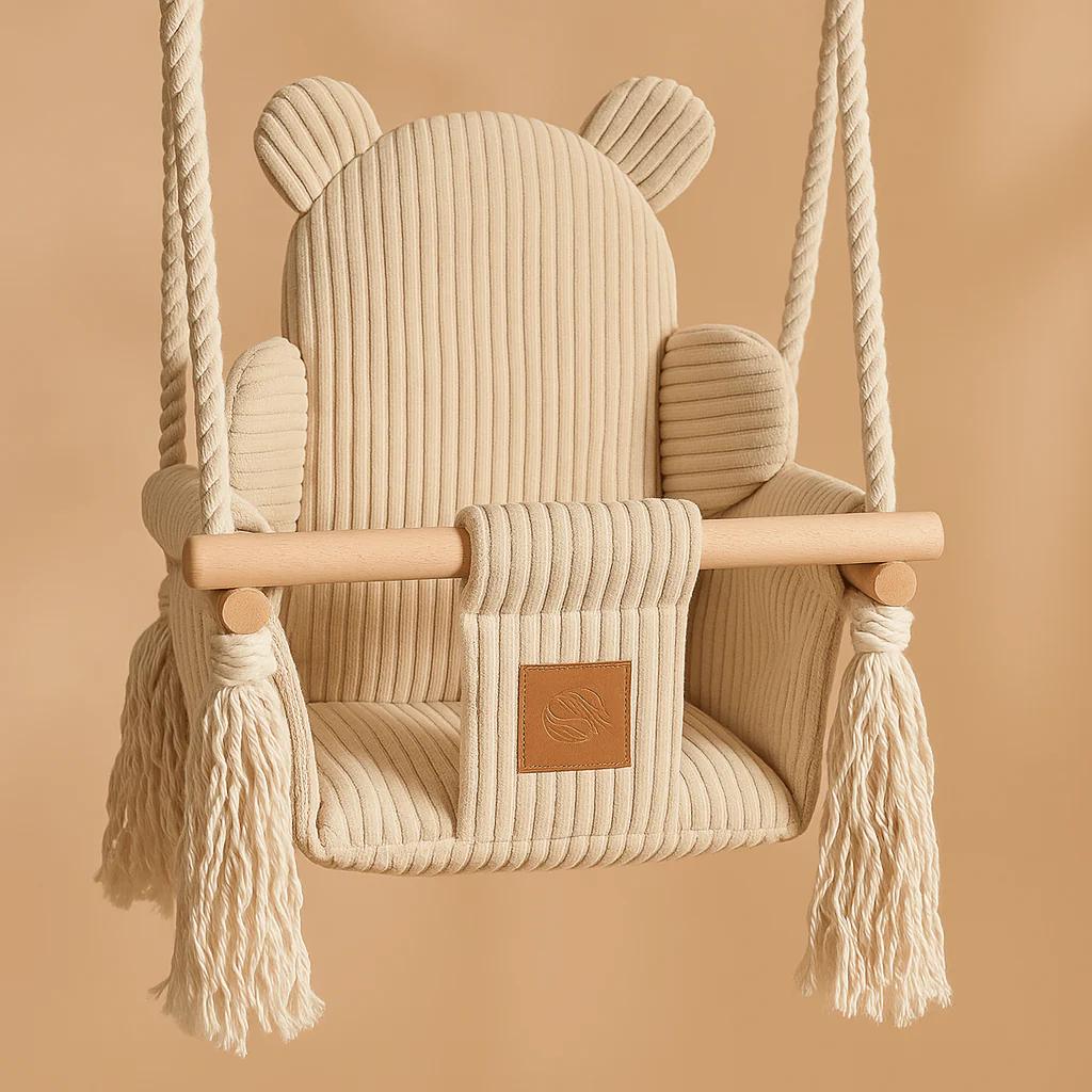 Design premium, gandit pentru confort si siguranta sezut moale din struks texturat , delicat cu pielea si usor de curatat. Constructie stabila din lemn natural , cu detalii finisate manual pentru siguranta maxima. Franghii groase din bumbac , reglabile, pentru o instalare usoara si echilibru perfect. Centura de siguranta integrata , care mentine copilul in pozitie stabila in timpul leganatului. Perna moale inclusa , pentru confort suplimentar si sustinere corecta a spatelui. Perfect pentru: camere de copii in stil boho sau scandinav , momente de relaxare, lectura sau joaca, utilizare zilnica in living, dormitor sau coltul de joaca. Caracteristici produs Material: struks moale + elemente din lemn natural Franghii: bumbac 9 mm , rezistente si reglabile Siguranta: centura integrata si sezut ranforsat Perna: inclusa, moale si confortabila Dimensiuni sezut: aprox. 35 Ãmdash; 35 cm Greutate maxima admisa: pana la 25 kg Varsta recomandata: de la 6 luni , sub supravegherea unui adult Montaj: simplu si sigur , include carlig de prindere Detalii estetice care fac diferenta Margini atent finisate si franjuri boho lucrate manual , care ofera un aer natural si elegant camerei copilului. Design rafinat si functional , adaptat perfect interioarelor moderne, in nuante calde, usor de integrat. MeowBaby reg; , siguranta, bucurie si frumusete in fiecare detaliu Fiecare leagan MeowBaby reg; este realizat manual in Polonia din materiale sigure si certificate, gandit sa ofere copiilor momente de joaca pline de bucurie si siguranta deplina . Designul sau atemporal face din Bear Swing nu doar o jucarie, ci o piesa decorativa ce transforma spatiul copilului intr-un colt de visare. Cadoul perfect pentru baby shower, aniversari sau amenajarea camerei copilului.